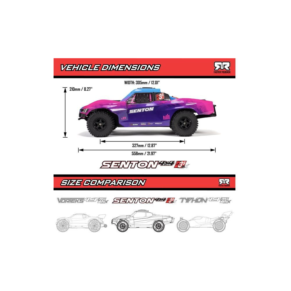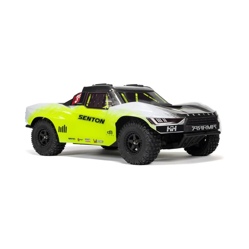Az Arrma Senton RC autómodell meglep majd szívósságával és tartósságával. Masszív kompozit vázzal rendelkezik, oldalsó Nerf megerősítésekkel és megemelt oldalfalakkal a szennyeződések bejutása ellen. Az alacsony alváz lehetővé teszi a nagy sebességű kanyarvételt. A modell alkalmas kemény felületekre, kavicsra és alacsony fűre. A használt fém fogaskerekek kellően tartósak a váltakozó áramú meghajtáshoz. A teljesítmény az első és hátsó differenciálmű segítségével jut el az egyes kerekekhez. A maximális tapadást a bevált dBoots Fortress SC gumiabroncsok biztosítják. A Spektrum SLT adó biztonságos, meghibásodás nélküli működést biztosít, a gondtalan vezetés érdekében a modell vízálló* alkatrészeket használ - egy Spektrum 2 az 1-ben 85A vevővel ellátott szabályozót és egy nagy nyomatékú, fém fogaskerekes Spektrum S662 szervovezérlést.