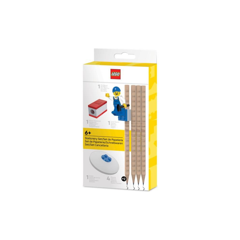 A klasszikus LEGO motívummal díszített iskolakészlet 4 ceruzát, egy LEGO ceruzacsipeszt, egy LEGO hegyezőt, egy radírt és egy LEGO minifigurát tartalmaz.