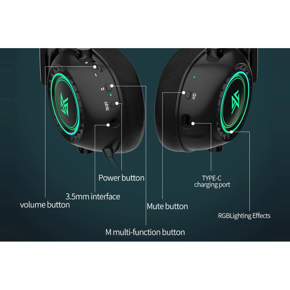 Vezeték nélküli Bluetooth gaming headset beépített, kiváló minőségű, minden irányba mozdítható mikrofonnal. Nagyszerű hangértelmezést kínál játék vagy hívás közben. Egyetlen feltöltéssel a headset akár 68 órán át is bírja (RGB világítás kikapcsolva). A headsetet a mellékelt 3,5 mm-es audiokábellel is csatlakoztathatja. Tartalmaz egy 2,4 GHz-es USB-adóegységet is, amely a számítógéphez vagy laptophoz csatlakoztatva mindössze 30 ms átviteli késleltetést biztosít. Az anyagoknak, az állíthatóságnak és a kezelőszerveknek köszönhetően a fejhallgatót nagyon kényelmes viselni és intuitívan kezelhető. Impedancia: 32 Ohm; Érzékenység: 95±3 dB; Bluetooth: 5.0; Átviteli távolság >10 m; Töltés: USB-C, 2 óra; Akkumulátor kapacitás: 1200 mAh; Súly: 355±10 g.