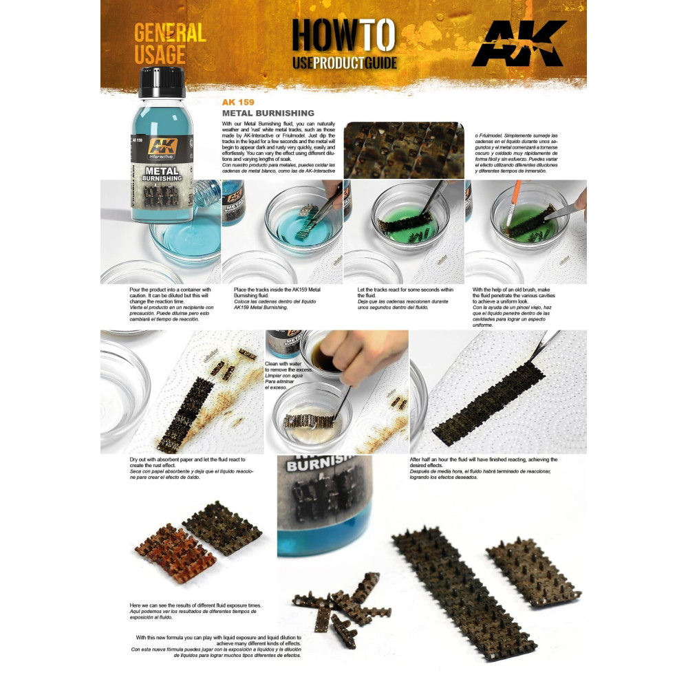Špeciálny výrobok. Nové rýchlejšie zloženie (funguje v priebehu niekoľkých sekúnd) a za výhodnejšiu cenu. Tento produkt sme v AK-Interactive podrobne testovali, vytvorili a vylepšili. S našou tekutinou na vypaľovanie kovov môžete prirodzene zvetrať a zhrdzavieť biele kovové pásy, napríklad tie, ktoré vyrába Friulmodel alebo naše. Stačí na niekoľko sekúnd ponoriť pásy do kvapaliny a kov začne veľmi rýchlo, jednoducho a bez námahy pôsobiť tmavým a hrdzavým dojmom. Efekt môžete meniť pomocou rôznych riedení a rôznej dĺžky namáčania. Pri použití menšieho množstva prípravku môžete dosiahnuť ešte lepšie výsledky ako s naším predchádzajúcim prípravkom.