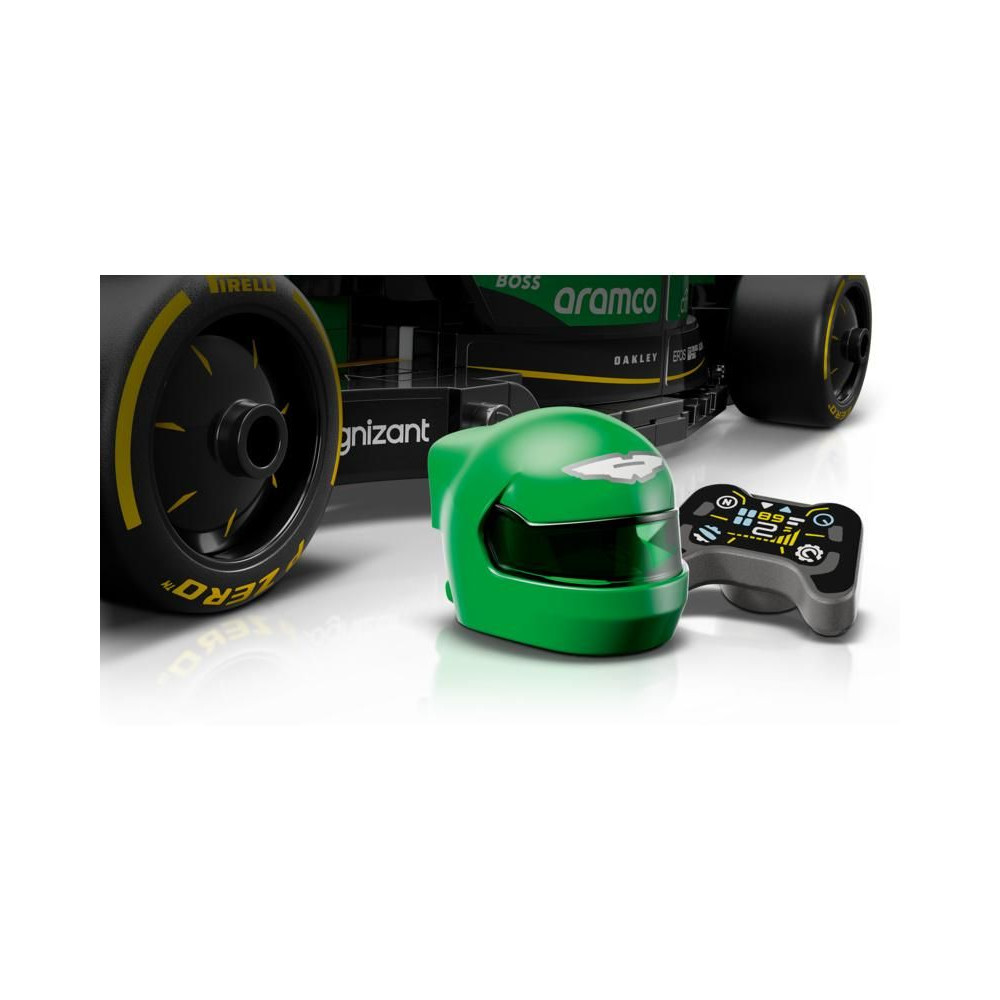 Az Aston Martin Aramco F1 versenyautó pilótafülkéje a glória felemelésével nyitható, emellett tartalmaz hátsó szárnyat, párhuzamos tengelyt, szponzori matricákat és szélesebb, "Pirelli" feliratú hátsó gumiabroncsokat is. A készlet tartalmaz egy Aston Martin Aramco F1 ruhát és szárnyas sisakot viselő sofőr minifigurát is, amelyet a pilótafülkébe helyezve a gázpedálra léphetsz.