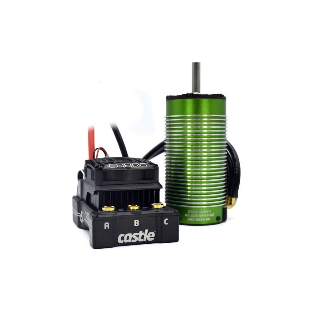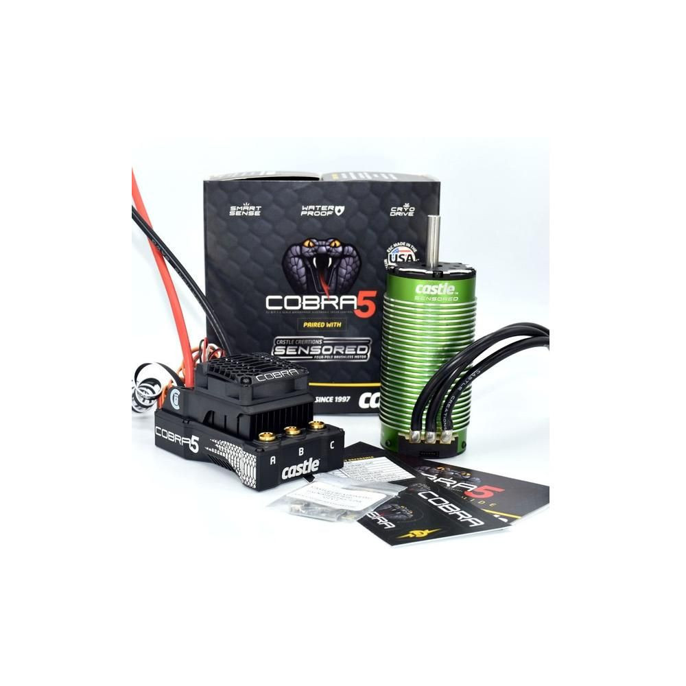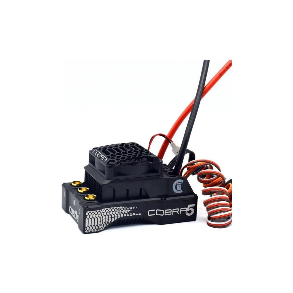 Extra erős Castle Cobra 5 vezérlő AC szenzoros motorral, 2028-800kv-os teljesítménnyel, 1:5 és 1:7 méretarányú RC autómodellekhez, 13 kg-ig. Tápegység: 3-8S LiPo, BEC 5-8.5V (20A). Vízálló konstrukció, kiegészítő bemenet a verseny közbeni változtatásokhoz, mért adatok rögzítése. CRYO-DRIVE technológia.