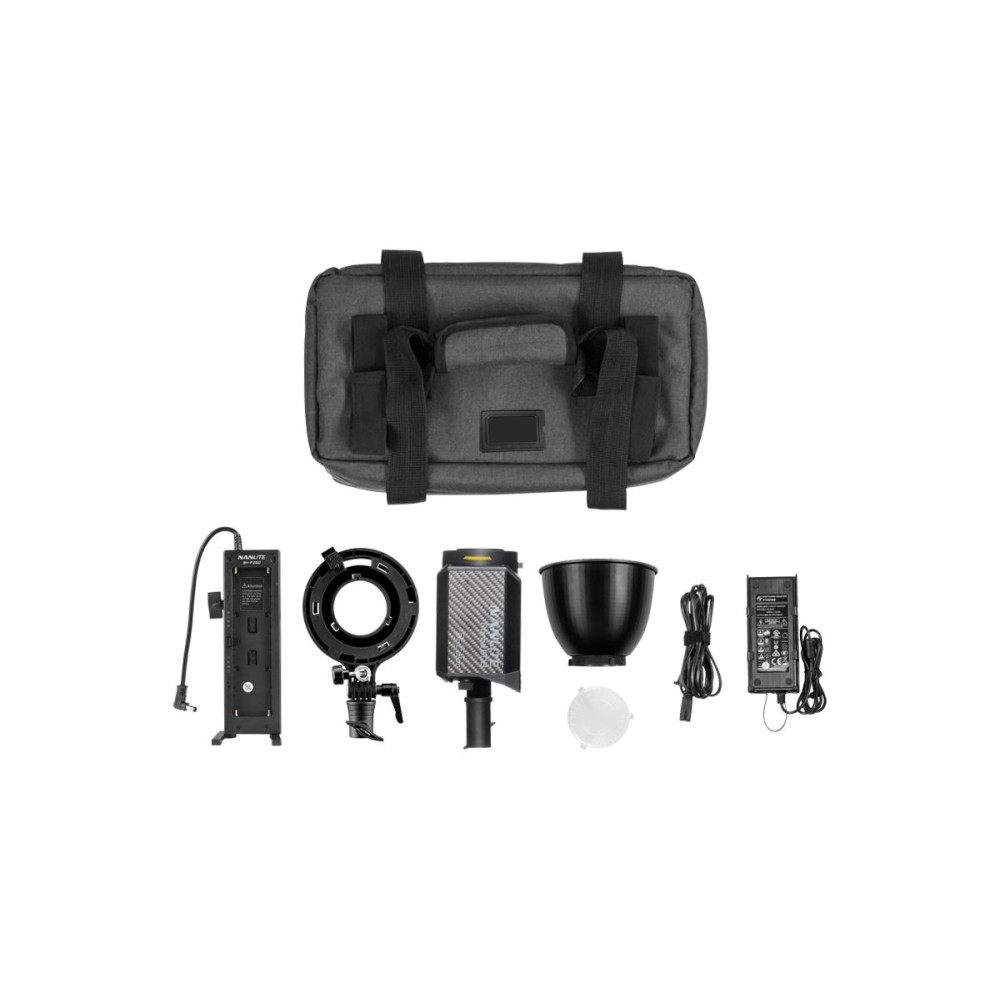 1x Nanlite Forza 60B LED lámpa 1x hálózati adapter 1x tápellátás3M kábel 1x 55°-os reflektor RF-FZ60 1x Akkumulátor tartó BH-FZ60 1x Bowens adapter 1x táska