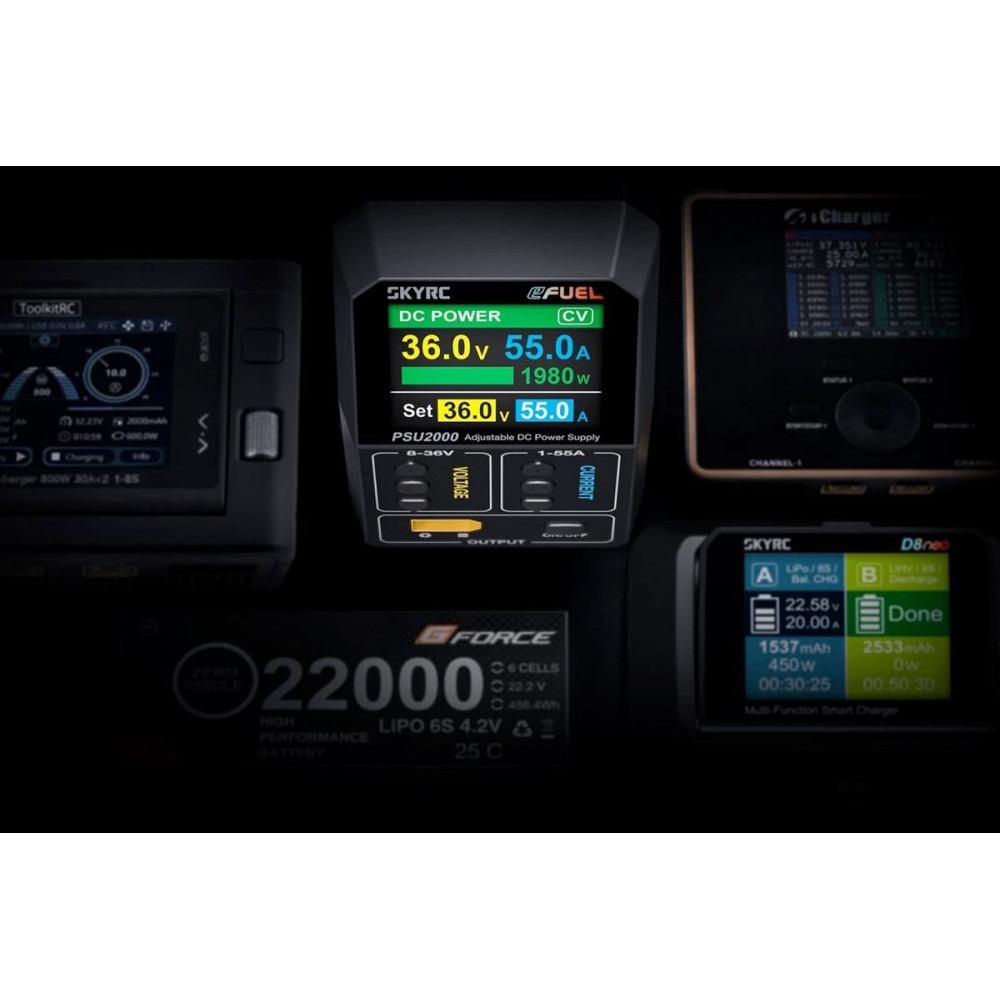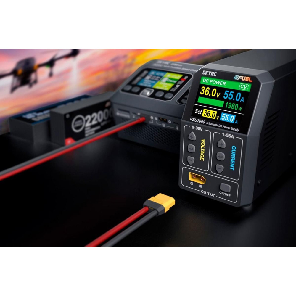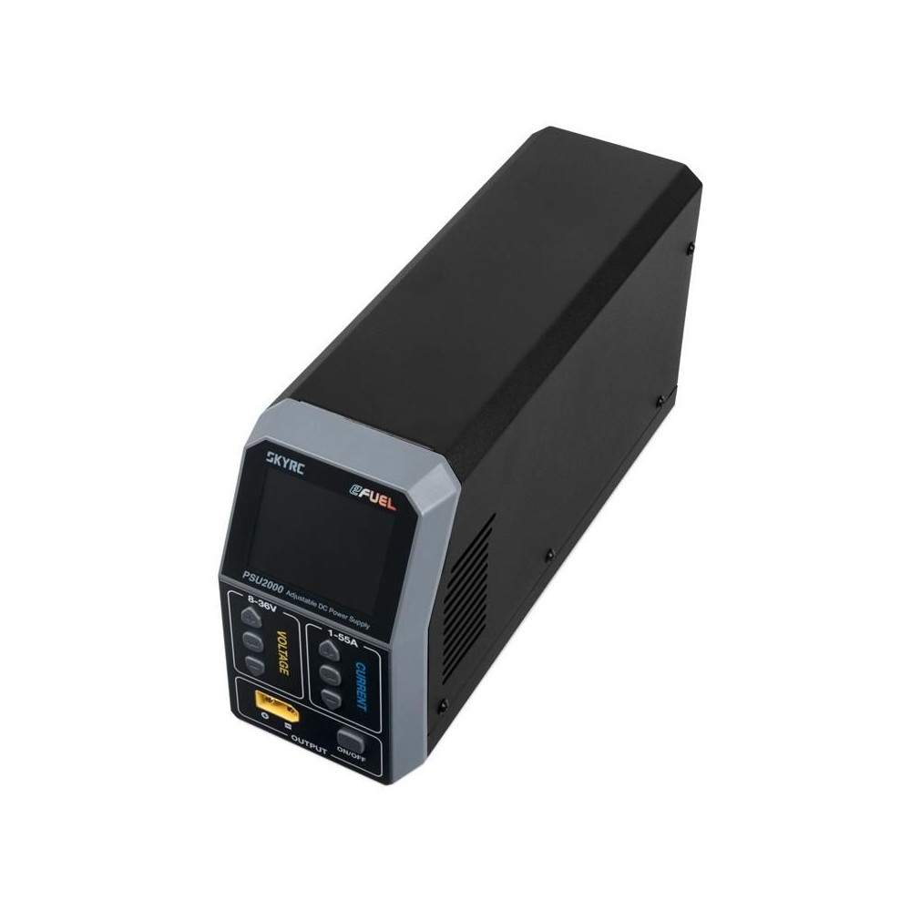 A nagy teljesítményű - mégis könnyű, kompakt, tartós alumínium házban elhelyezett - PSU2000 stabilizált hálózati tápegység ideális modelltöltők és egyéb eszközök táplálására. 8-36 V között állítható kimeneti feszültséget és 1-55 A áramerősséget kínál, akár 2000 W teljesítménnyel.