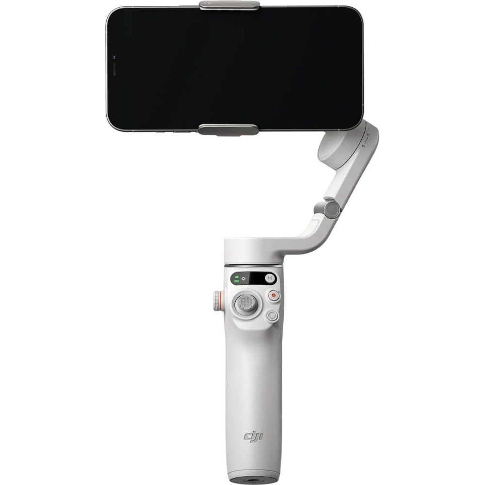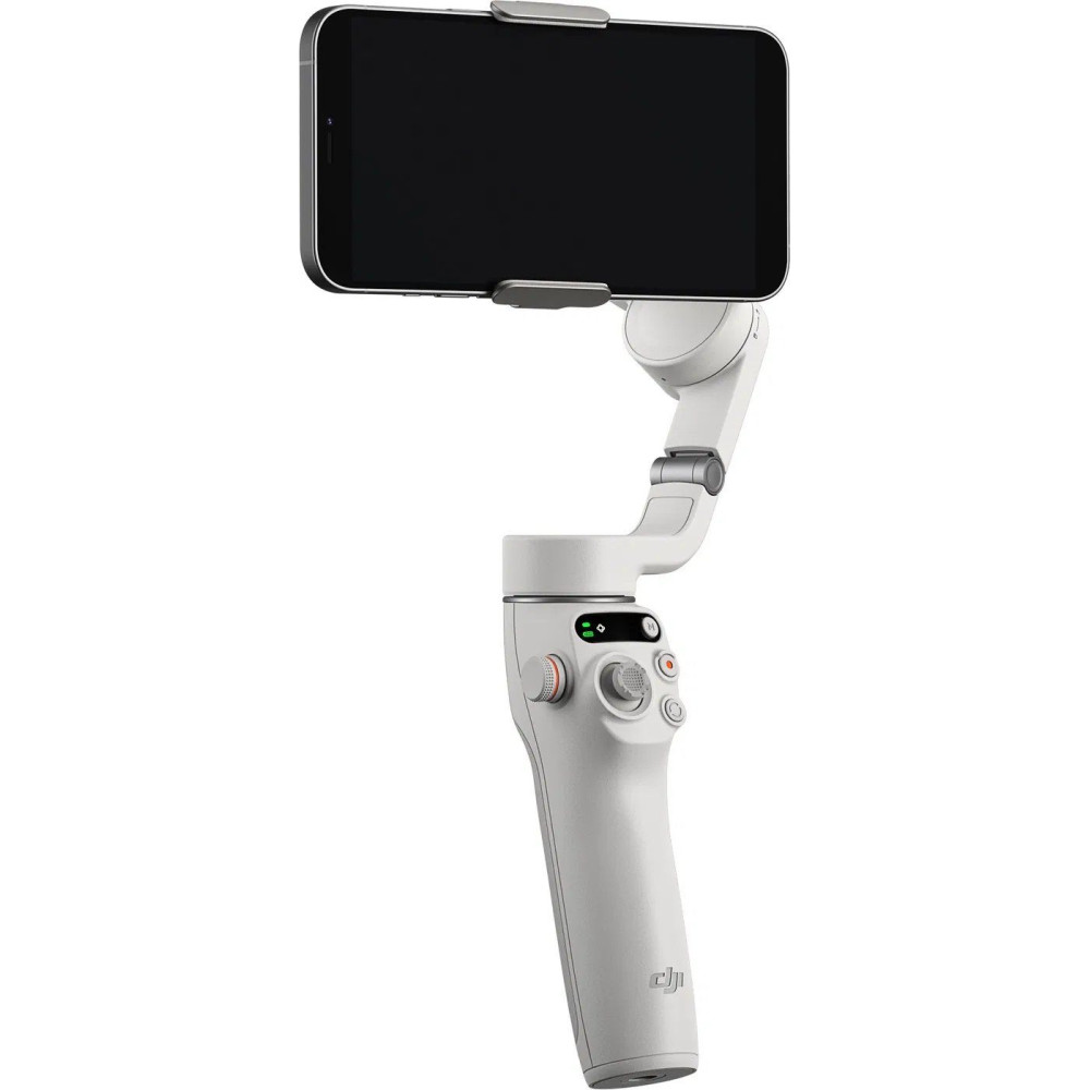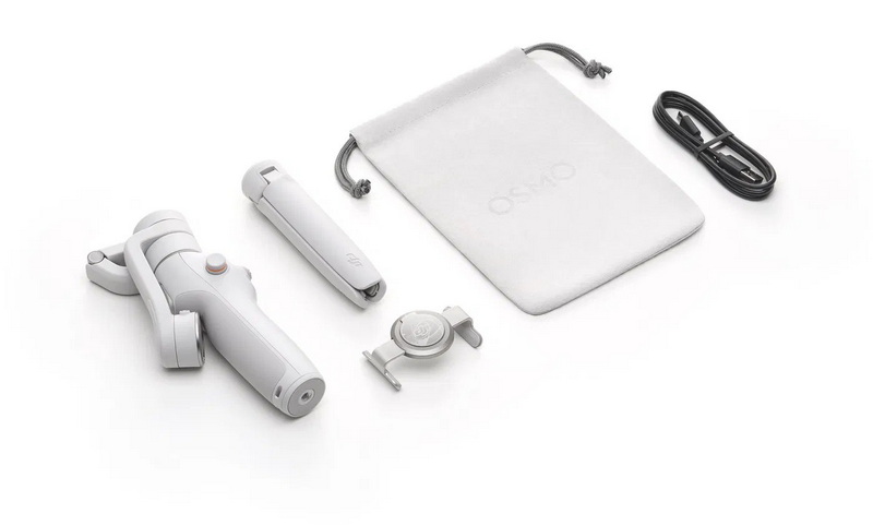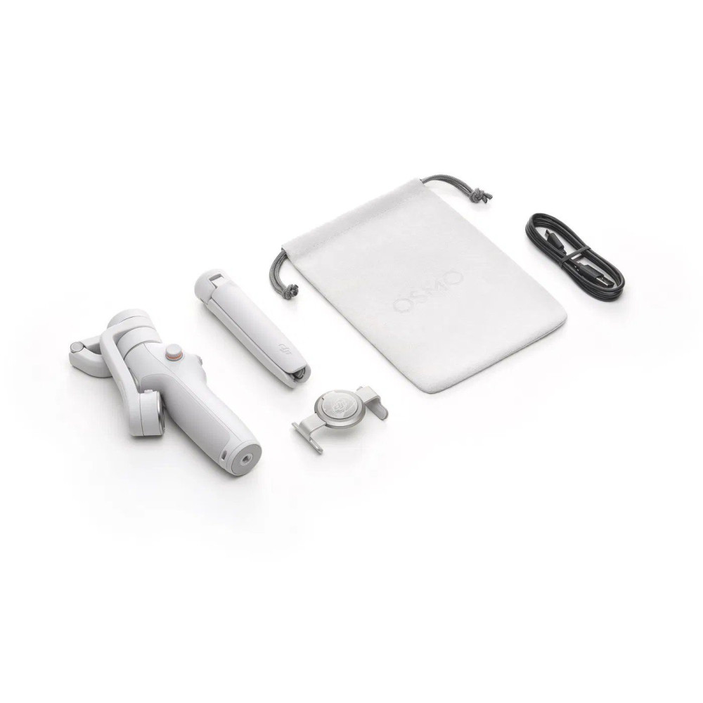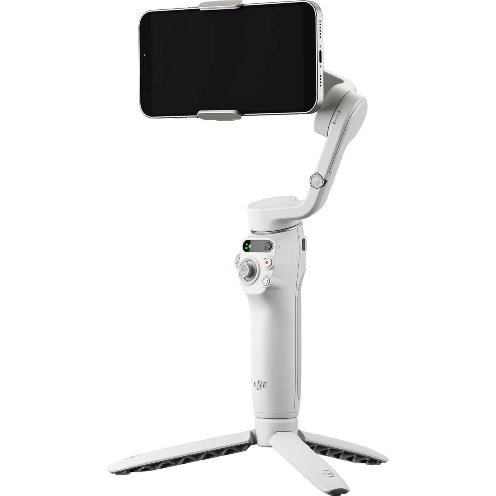 - A DJI Osmo Mobile 6 (platinaszürke) állványlábbal van felszerelve.