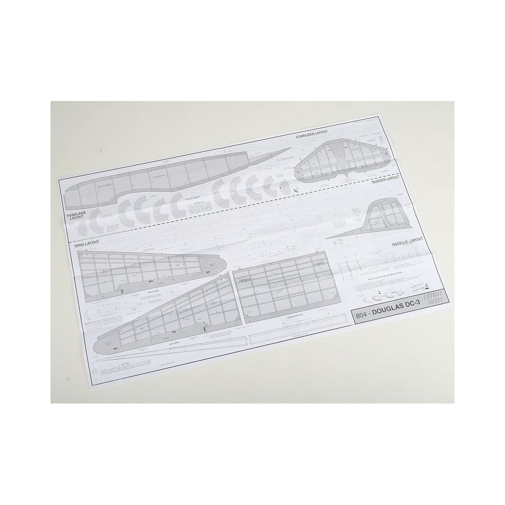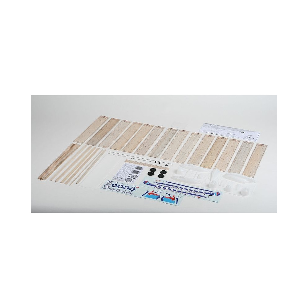 Akészlet a következőket tartalmazza: balsából előre kivágott alkatrészek, balsából készült gerendák, műanyag rétegelt lemezből előre kivágott alkatrészek, vákuum-formázott makett alkatrészek (motorháztető, motorok, törzs orra...), műanyag kerekek, acélzsinór a futóműhöz és egyéb apró alkatrészekhez, bevonópapír, ív nedves matricák, építési terv.