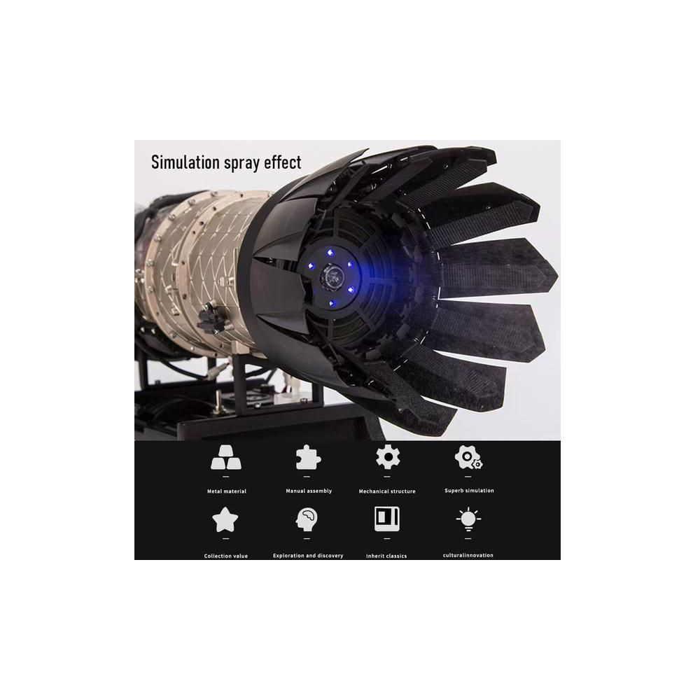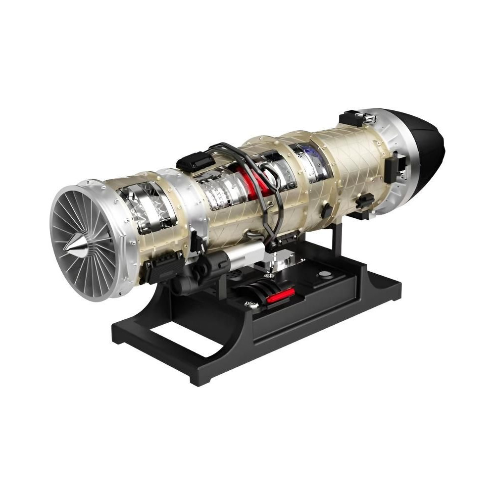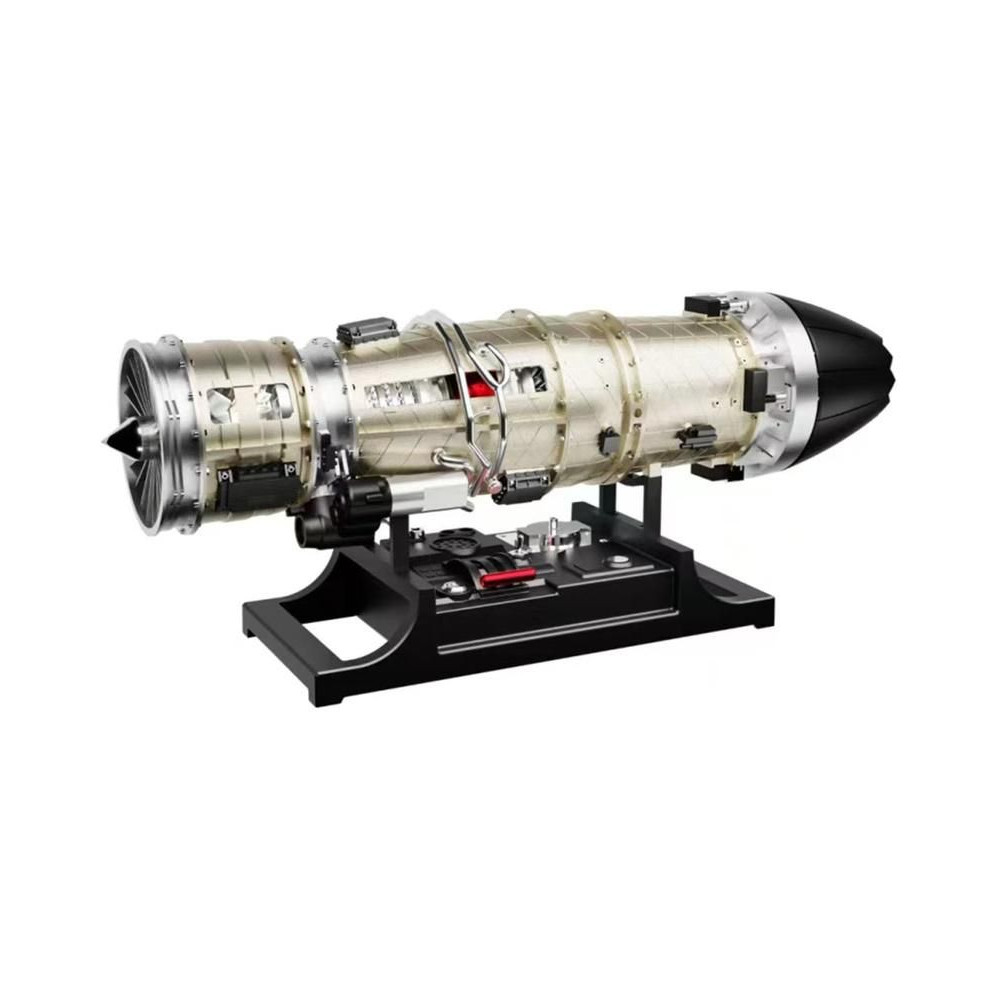 Precíz fém Teching modellkészlet - alacsony bypass sugárhajtómű. Egy valódi hajtómű hitelesen kidolgozott konstrukciója. Valósághű mechanikai funkciók - rotormozgás, állítható fúvókalapátok. Elektromos forgatás, háttérvilágítású fúvóka, hang- és füsteffektek. Kiállítási modell.