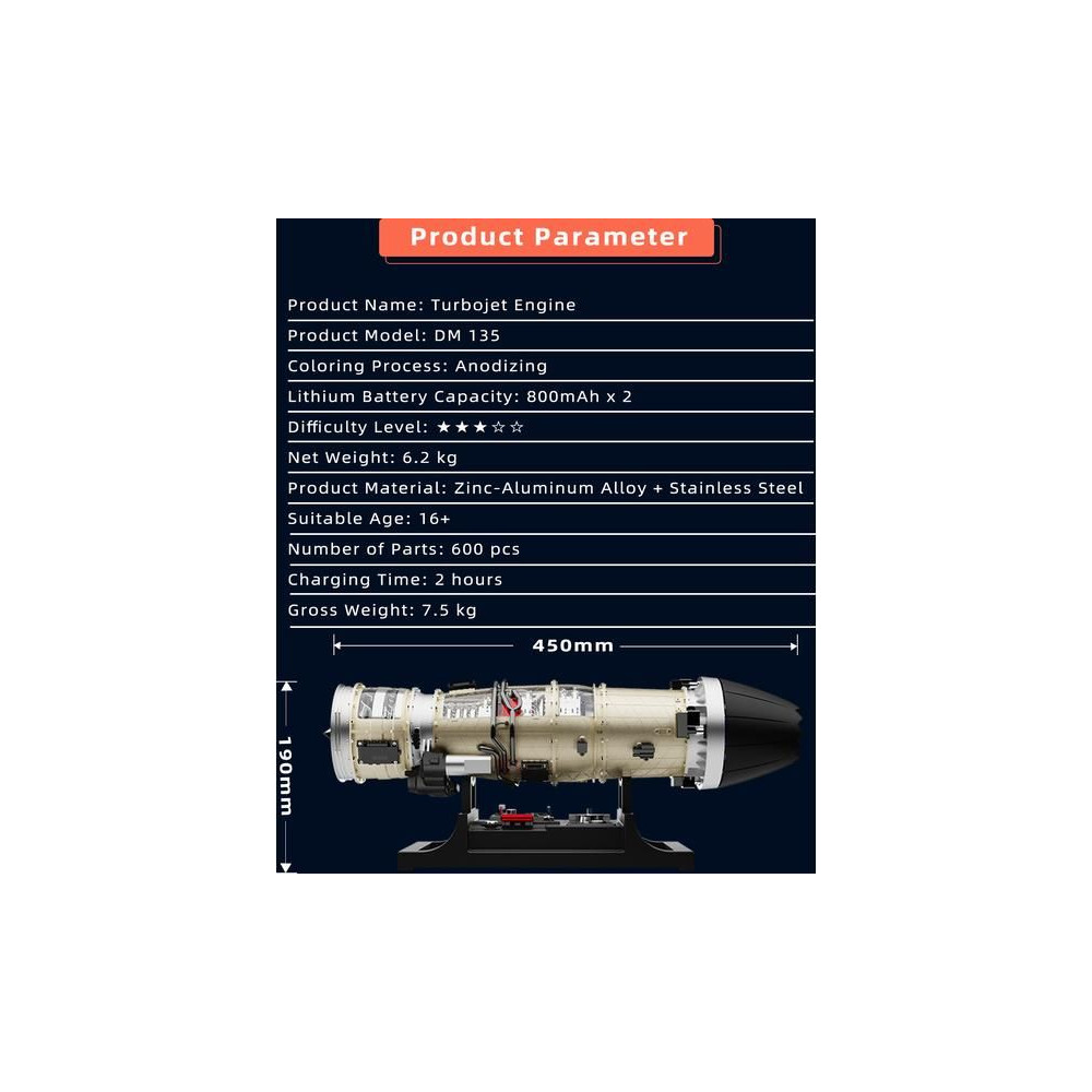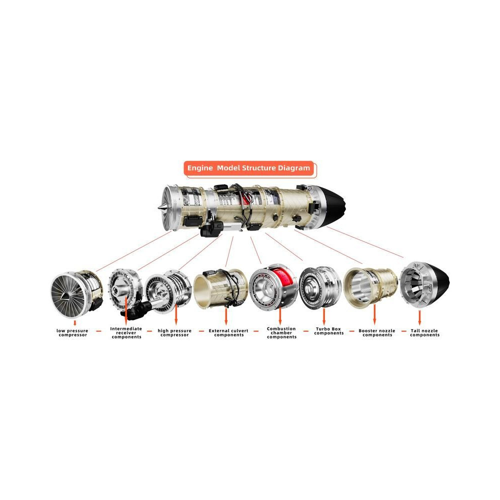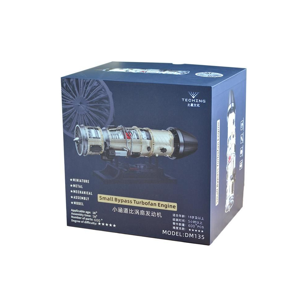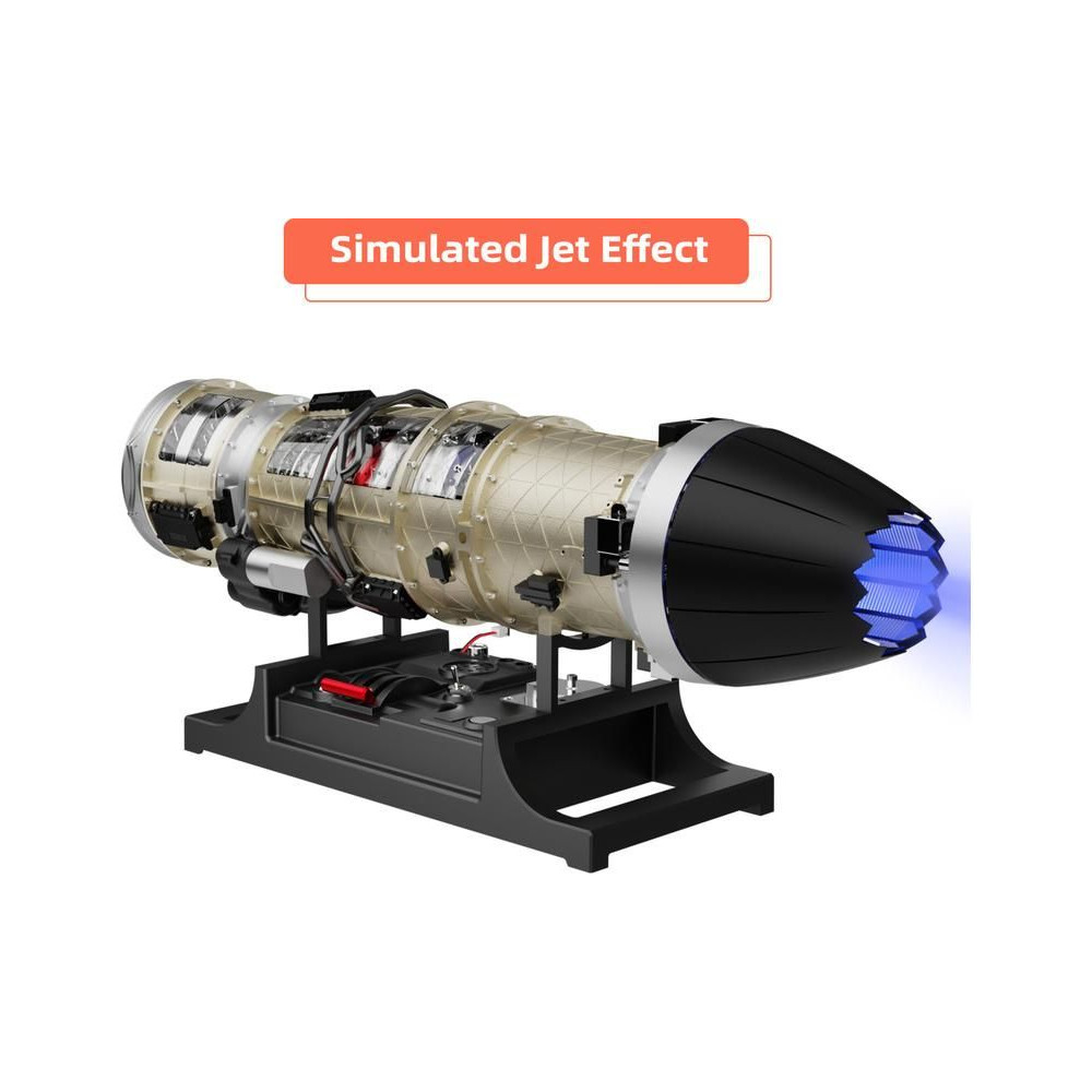 Precíz fém Teching modellkészlet - alacsony bypass sugárhajtómű. Egy valódi hajtómű hitelesen kidolgozott konstrukciója. Valósághű mechanikai funkciók - rotormozgás, állítható fúvókalapátok. Elektromos forgatás, háttérvilágítású fúvóka, hang- és füsteffektek. Kiállítási modell.