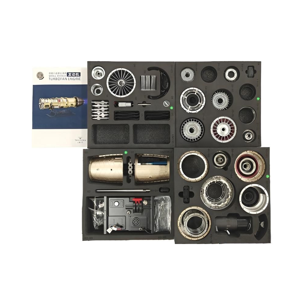 Precíz fém Teching modellkészlet - alacsony bypass sugárhajtómű. Egy valódi katonai hajtómű hitelesen kidolgozott konstrukciója ablakokkal a működés bemutatásához. A modell valósághű mechanikai funkciókat kínál - a rotor mozgása és manuálisan állítható lamellák a kimeneti fúvóka tolóerejének szabályozására. A hajtómű elektromos forgatással, háttérvilágítású fúvókával, hang- és füsteffektusokkal rendelkezik. A hajtómű fordulatszáma a repülőgépek pilótafülkéiben használt gázkarok ihlette karral szabályozható. A beépített hangszóróból érkező hajtómű hangja a forgási sebességnek megfelelően változik. Egyedi kiegészítő a kéken megvilágított fúvóka, amelyből a légáram füstöt bocsát ki. Desztillált víz hozzáadásával füstöt vagy gőzt hoznak létre. A fő alkatrészek hűen ábrázoltak, beleértve a ventilátort (fúvót), a kétfokozatú alacsony nyomású kompresszort, a hatfokozatú nagynyomású kompresszort, az égésteret, a nagynyomású turbinát és a kétfokozatú alacsony nyomású turbinát. A készletet úgy tervezték, hogy maga az összeszerelés élmény legyen. A kiváló minőségű kidolgozásnak és az egyes alkatrészek látható funkcionalitásának köszönhetően a modell alkalmas kiállítási és reprezentatív tömörmodellként, vagy oktatási segédeszközként. A modellt diákok, technológia-rajongók és gyűjtők egyaránt értékelni fogják. A Teching márka eredeti tervezésű és gyártású darabja, precízen megmunkált fém alkatrészekkel, a könnyű összeszerelést segítő képes útmutatóval és prémium csomagolással.