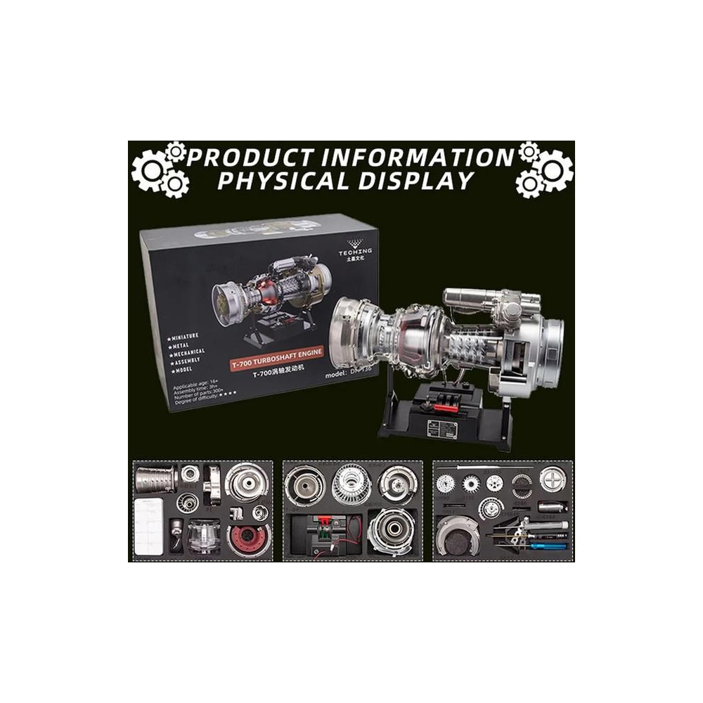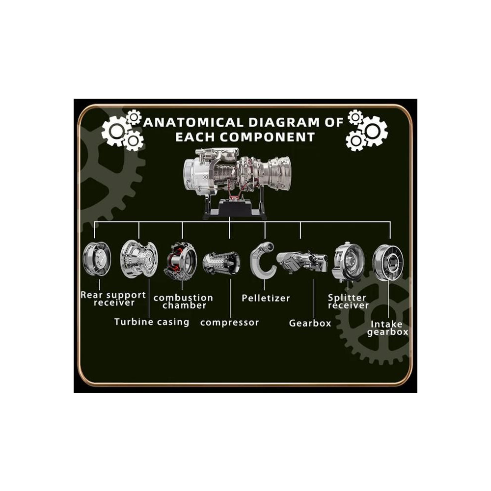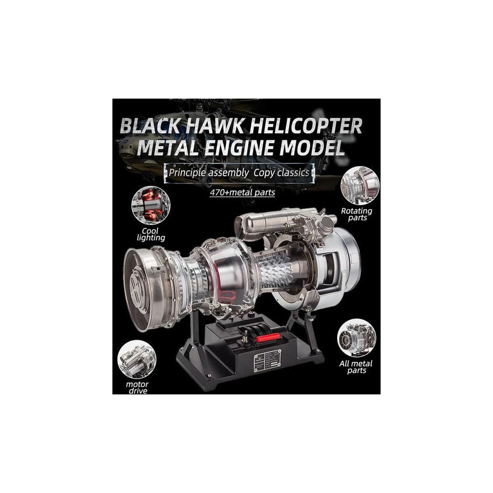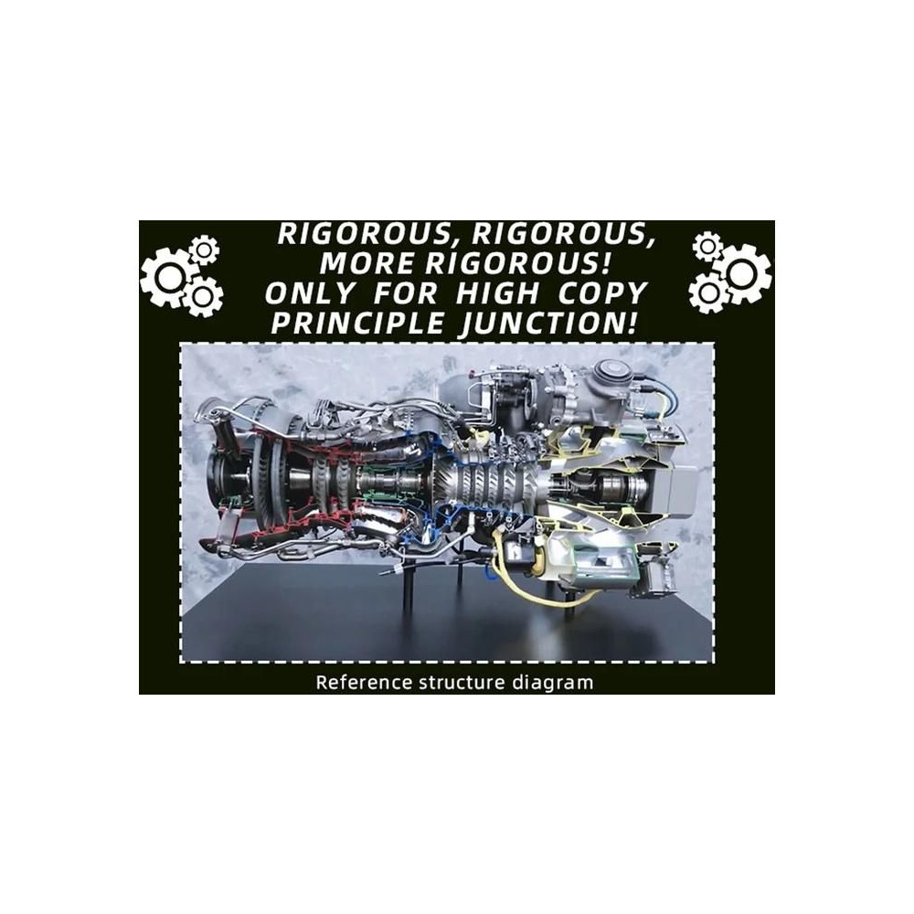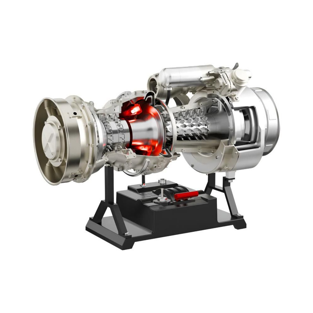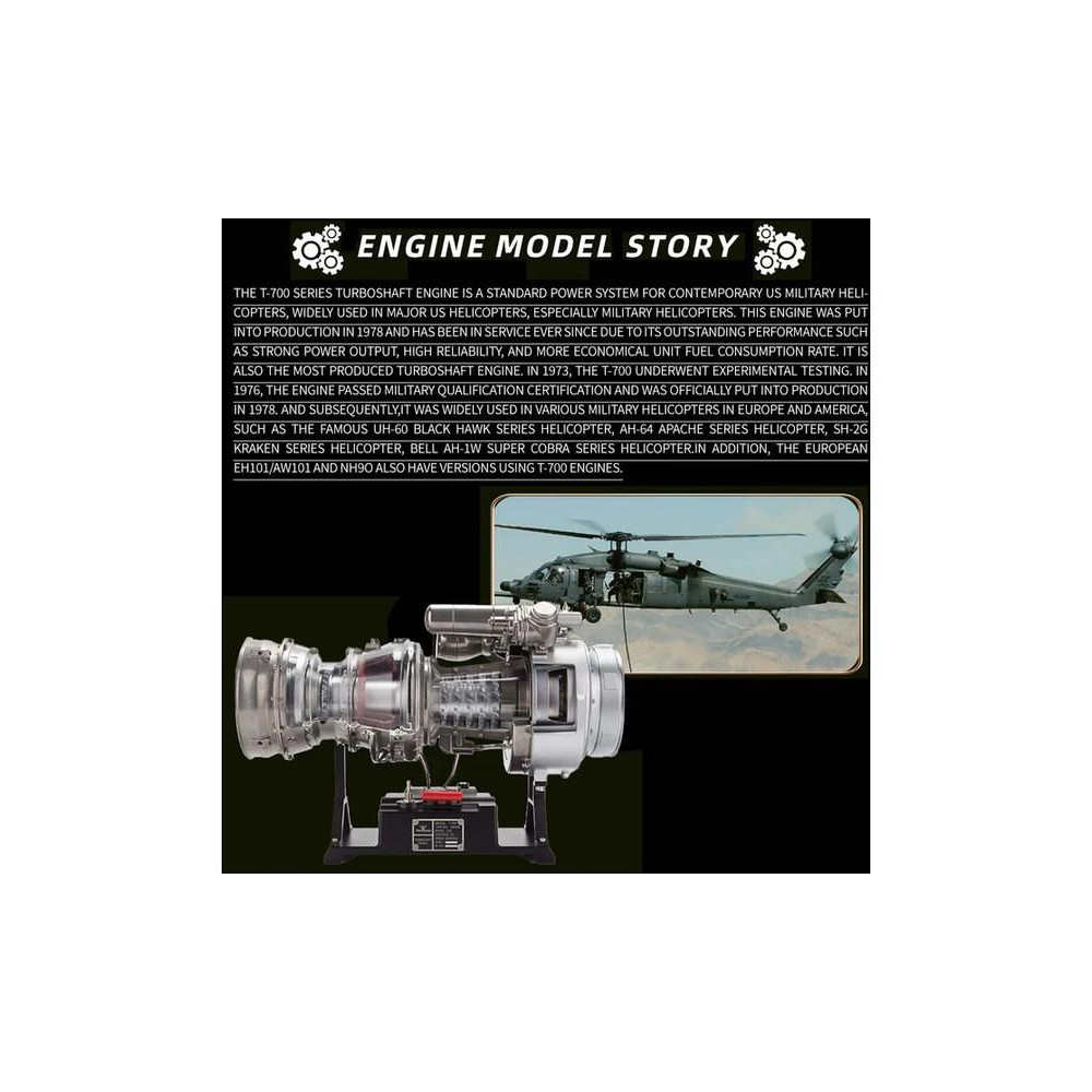 A Teching készlet turbinás motormodelljének alapvető műszaki modellje egy valódi turbótengelyes motor, amely olyan modern katonai helikoptereket hajt, mint a Sikorsky UH-60 Black Hawk és az AH-64 Apache. Ezek a helikopterek hagyományosan a General Electric T700/CT7 motorcsaládot használják – amelyeket nagy megbízhatóságra, teljesítményre és hatékonyságra terveztek igényes üzemeltetési körülmények között. A T700 motor többfokozatú kompresszorral, égéstérrel és szabad turbinával rendelkezik, amely a motor tolóerejét mechanikai energiává alakítja a fő- és farokrotorok számára egy sebességváltón keresztül. Ez a kialakítás nagy teljesítményt biztosít alacsony súly mellett, és lehetővé teszi a helikopterek hatékony repülését nagy hasznos terheléssel még szélsőséges magasságokban és hőmérsékleteken is.