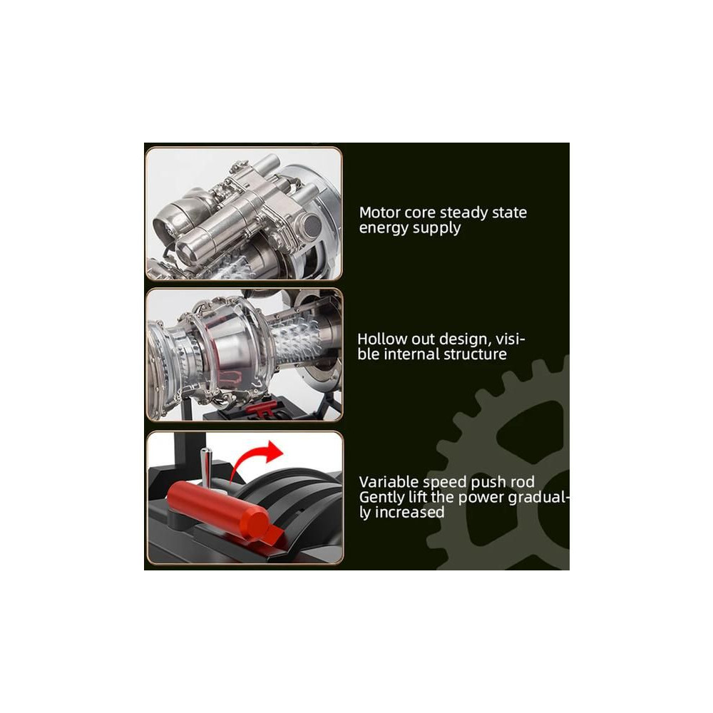 Precíz fém Teching modell készlet - csőtengelyes motor. Autentikusan kidolgozott katonai motor konstrukció átlátszó burkolattal a demonstrációhoz. Valósághű mechanikai funkciók - a rotor és a sebességváltó mozgása. Elektromos forgás, megvilágított égéstér. Kiállítási modell.