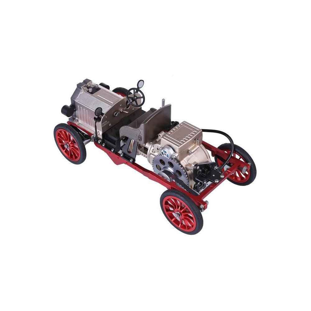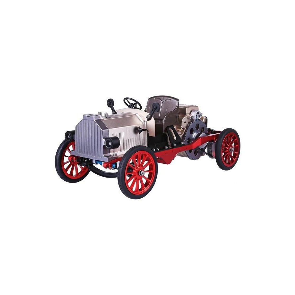 Teching precíziós fém modellkészlet - klasszikus autó. A modell egy egyhengeres motor mozgatható modelljét és egyéb, a mechanikai elveket bemutató funkciókat tartalmaz. A motor modellje hosszában van elhelyezve az autóban, és hűen kidolgozott, beleértve a dugattyúk, szelepek és elosztópanelek mozgását. Az ablakokon és a nyitott hengerfejen keresztül megfigyelhető az alkatrészek szinkronizált mozgása. A modell motorját egy villanymotor hajtja. Egy kar, egy bowden és egy kuplung segítségével a hátsó kerekek hajtása csatlakoztatható, így a motor akkor is járhat, ha a modell álló helyzetben van. Az autó dizájnja klasszikus, rengeteg részlettel és laprugós felfüggesztéssel. A modell nemcsak kiállítási darab, hanem egy funkcionális távirányítású autó is. Tartalmaz villanymotort, funkcionális szervovezérlést, világítást, elektronikát és akkumulátort. Bluetooth-on keresztül vezérelhető a telefonon található teching edu alkalmazással.