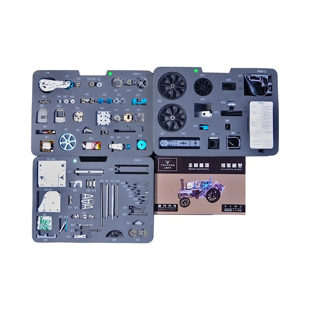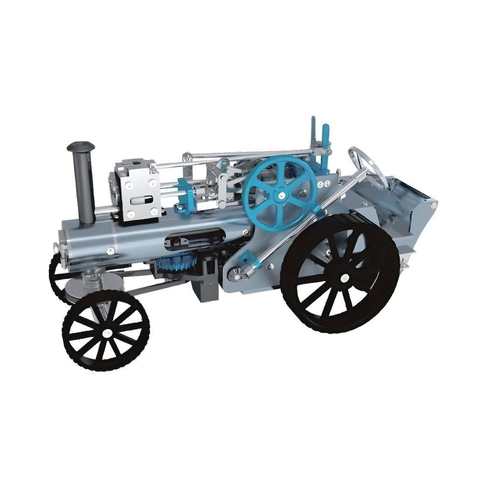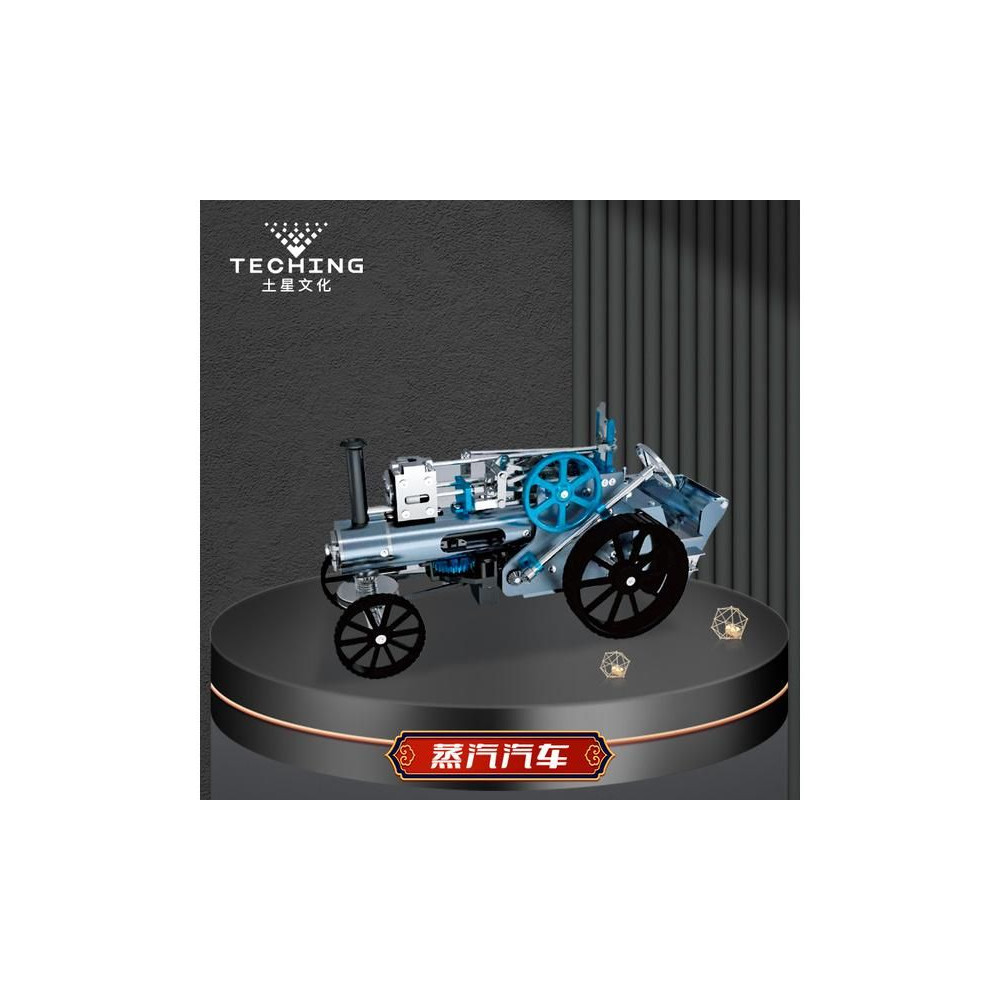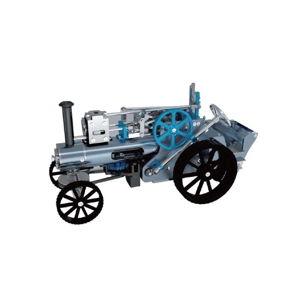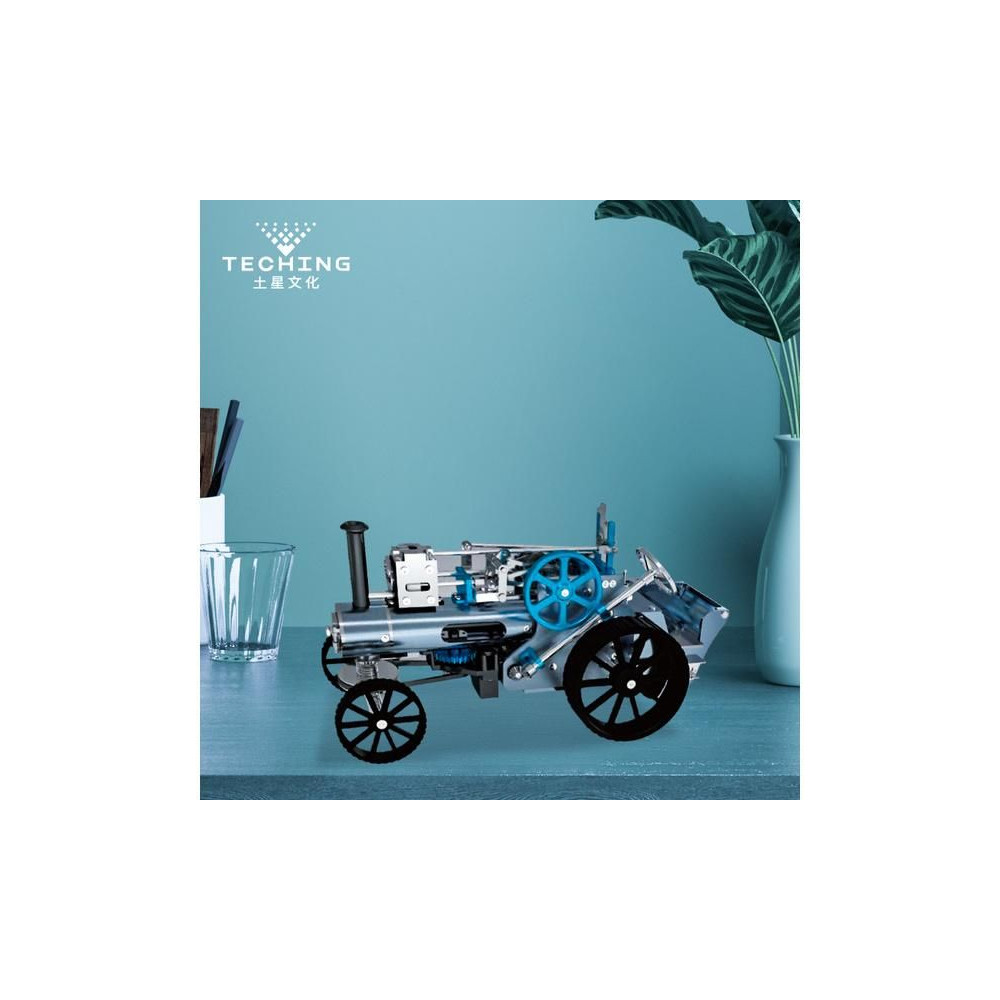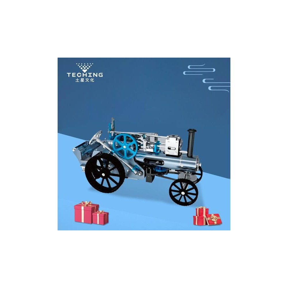Teching precíziós fém modellkészlet - gőzgép. Tartalmaz egy mozgatható gőzgép modellt, egy dugattyút, egy sebességváltót és egyéb, a mechanikai elveket bemutató funkciókat. Az egyes funkciók hitelesen kidolgozottak. A makett dugattyú valóban mozog, és az egyenes vonalú mozgást forgó mozgássá alakítja. A sebességváltó és a karok segítségével szabályozható a sebesség, fékezhető vagy bekapcsolható a hátsó tengelyhajtás, így a motor akkor is járhat, ha a modell álló helyzetben van. A gőzgép vezérlőkarja is másolat. A kormánykerék segítségével manuálisan lehet kanyarodni. Az autó akkumulátorral, elektronikával és villanymotorral rendelkezik. Ennek köszönhetően a gőzgép életre kel, és a modell előre halad.