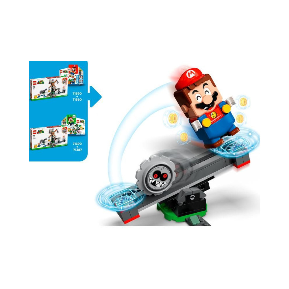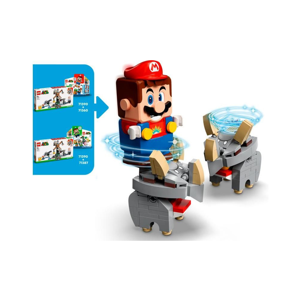A LEGO® Super Mario™ Fighting Reznor bővítő készlettel (71390) adj lehetőséget a gyerekeknek, hogy új, szórakoztató kalandokat éljenek át a LEGO® Super Mario™ világában. Összeszerelhető forgó platformokat tartalmaz, amelyek egy LEGO® Mario vagy LEGO® Luigi figura mozgását pörgetik (a figurák nem tartoznak a csomagba). Üss le 2 Reznor figurát a forgó platformokról a fogazott ütővel, és mentsd meg a kék varangyot. A készlet tartalmaz továbbá egy Grrrollt, egy kérdőjellel ellátott akciókockát és egy speciális gyorsindító csövet is (Megjegyzés: A teljes interaktív játékélményhez rendelkezned kell a 71360 vagy 71387-es kezdő készlettel).