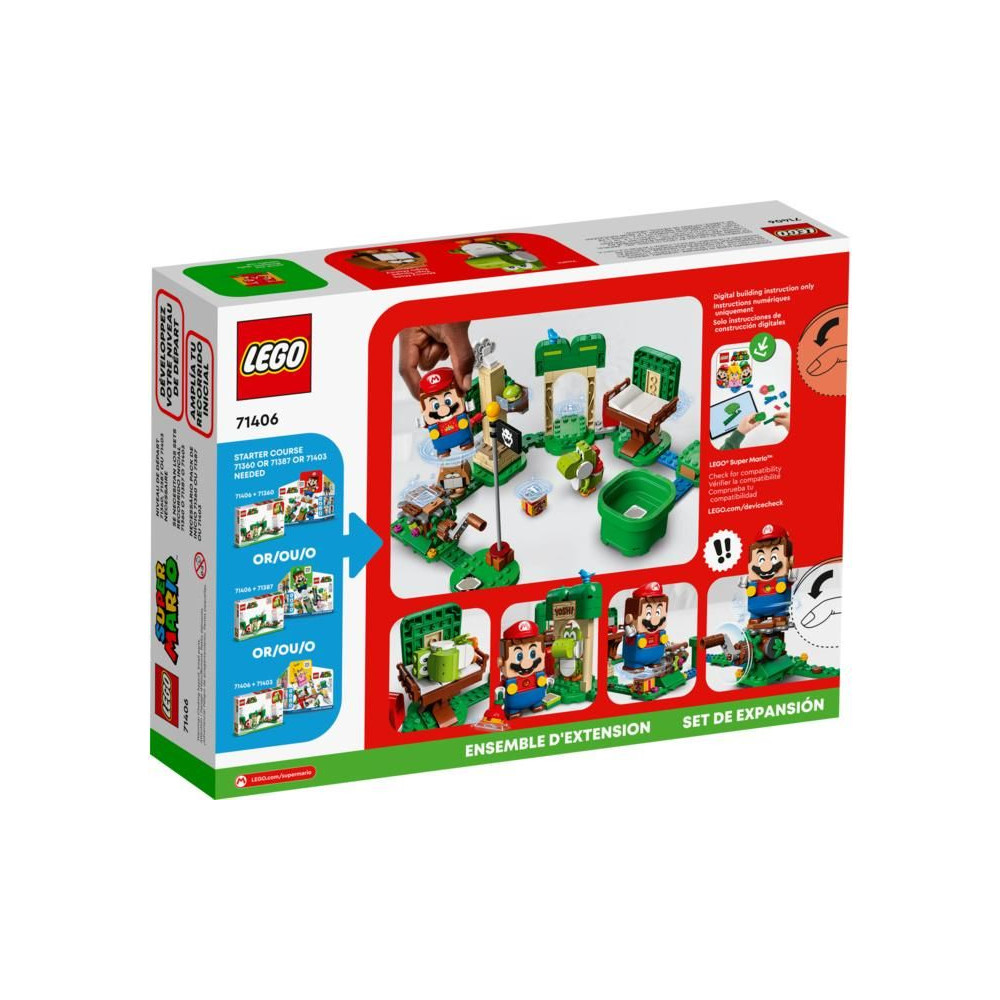 A LEGO® Super Mario™ Yoshi's House of Gifts bővítő készlettel (71406) a gyerekek egy újabb szórakoztató szintet élvezhetnek Yoshi és Monty Mole társaságában. A játékosok felfedezhetik a környéket és digitális érméket gyűjthetnek az interaktív LEGO® Mario, LEGO® Luigi vagy LEGO® Peach™ figurákkal (nem tartozék). Köszönj Yoshinak az ajtóban, szundíts az ágyban, gyűjts gyümölcsöt, pörgesd meg a jutalom körhintát, amitől a gyümölcsök aranyszínűvé válnak, és ajándékozd meg a többi interaktív figura egyikét. Vagy élvezd a gyümölcsöket magával Yoshival. (Megjegyzés: A teljes interaktív játékélményhez a 71360, 71387 vagy 71403-as Starter Set szükséges.)