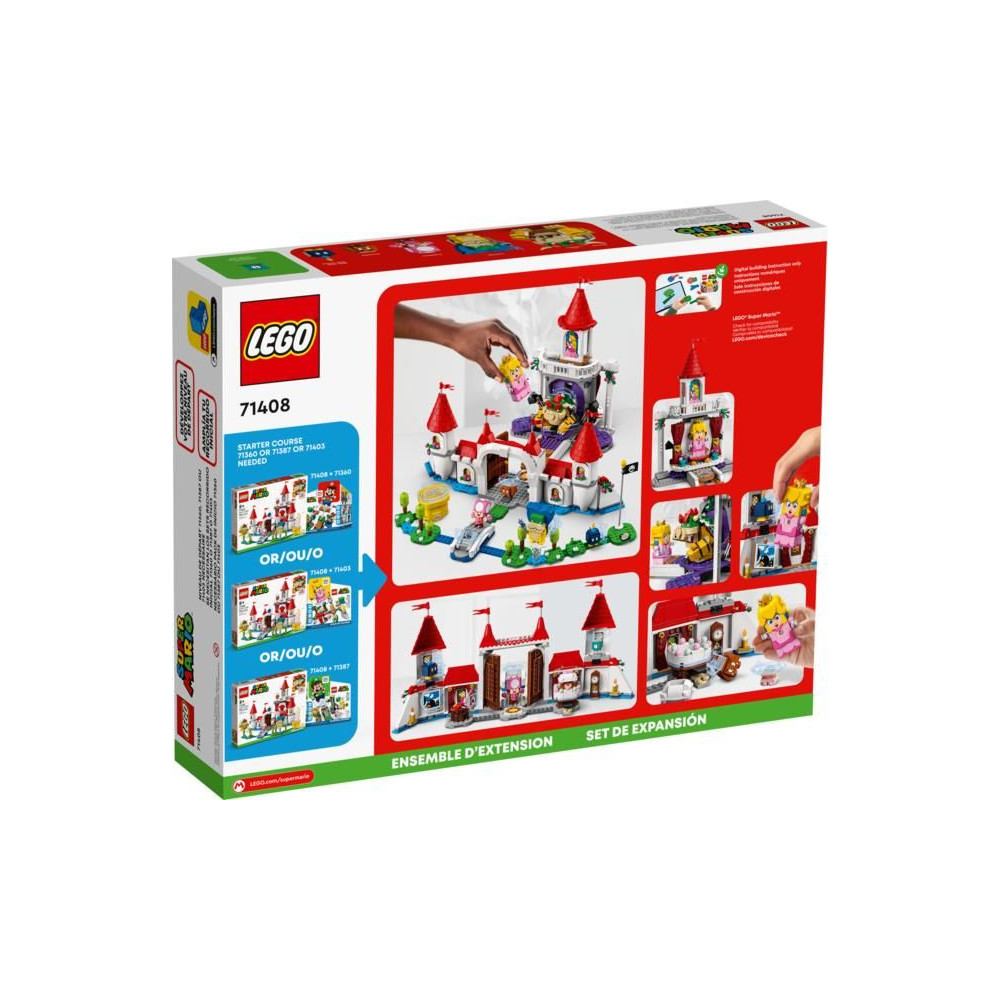 Adj lehetőséget a gyerekeknek, hogy a Castle Peach bővítő készlettel (71408) egy ikonikus helyszínnel bővítsék a LEGO® Super Mario™ játék világát. A játékosok számtalan elemet fedezhetnek fel és digitális érméket gyűjthetnek a legkülönbözőbb módokon az interaktív LEGO® Mario, LEGO® Luigi vagy LEGO® Peach™ figurákkal (nem tartozék). A modell tartalmaz egy tróntermet forgó fallal, amely mögött Bowser rejtőzik, egy ólomüveg ablakot Peach hercegnővel, egy Bob-omb festményt akciófunkcióval, egy Goomba-t rejtő tortát, egy különleges pipát , egy időkockát, egy "törött" hidat, egy tál lila gyümölcsöt és még sok mást. (Megjegyzés: A teljes interaktív játékélményhez a 71360, 71387 vagy 71403-as Starter szett szükséges.)