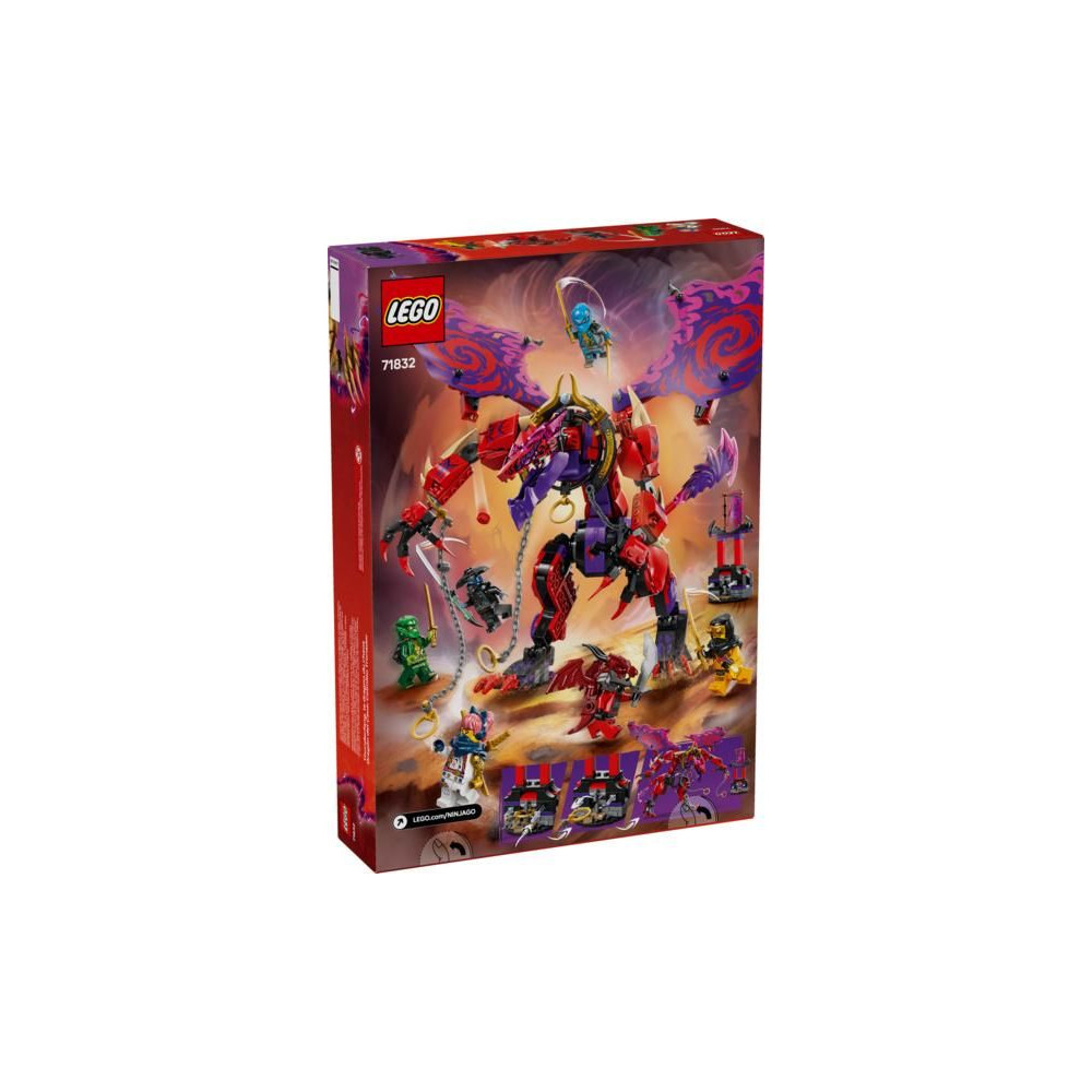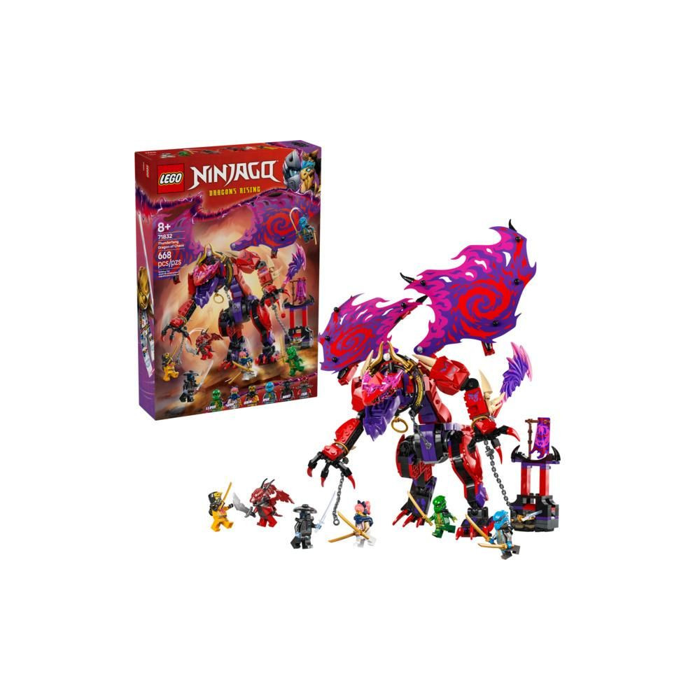 A LEGO® NINJAGO® (71832) Káosz Sárkány Mennydörgőagyar nindzsa építőkészlettel a 8 éves vagy annál idősebb fiúk és lányok emlékezni fognak a NINJAGO TV sorozat, a Sárkány ébredése 3. évadának izgalmas akciójeleneteire. Ez a gyerekjáték egy nagy sárkányt tartalmaz mozgatható farokkal, lábakkal, szárnyakkal, lábfejjel, fejjel és állkapoccsal, valamint minden szárny alatt egy-egy kilövővel. A sárkányfigura egy kis modellhez van rögzítve, és 2 prizmás pengével szabadítható ki.