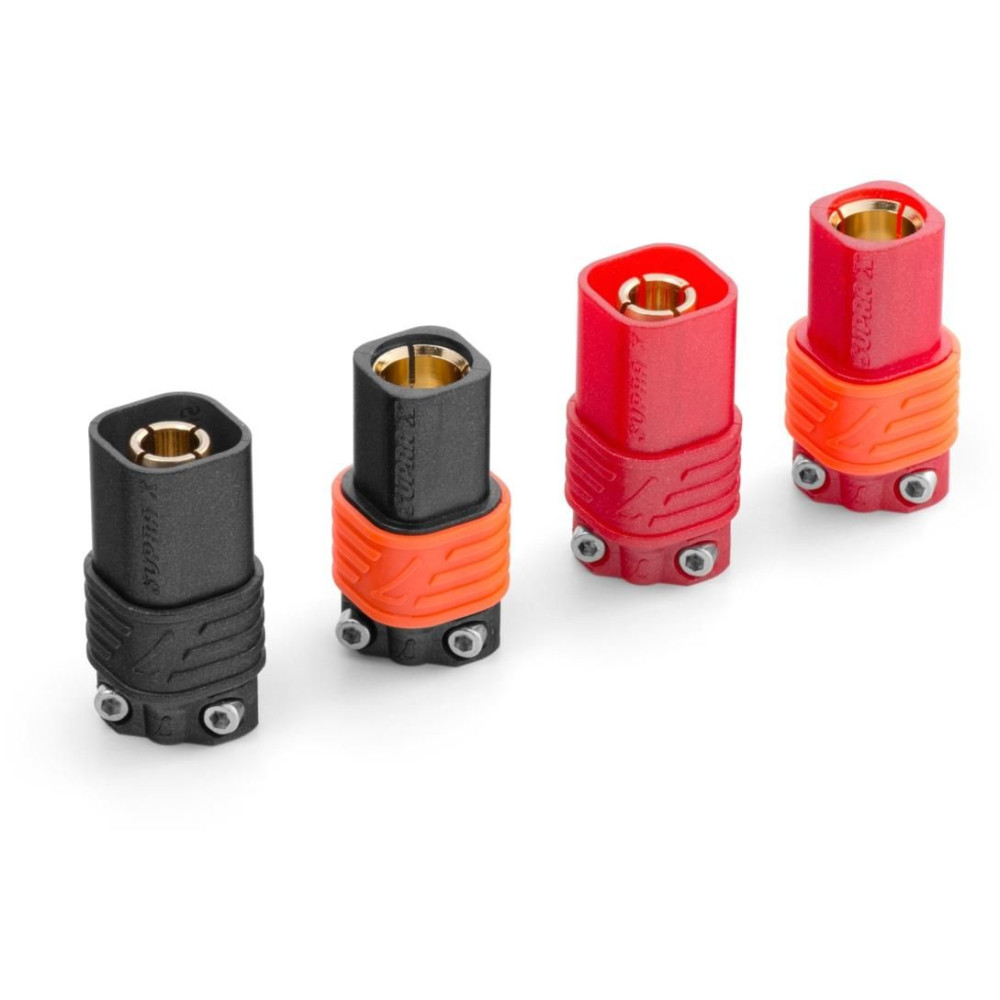 Aranyozott 7 mm-es csatlakozók házzal 8,4 mm2 (8 AWG) kábelhez. Állandó áram 280A, csúcsáram 320A. Forrasztásmentes változat - a kábel rögzítése két imbuszcsavarral történik. 8 pár darabos csomag (4 piros és 4 fekete).