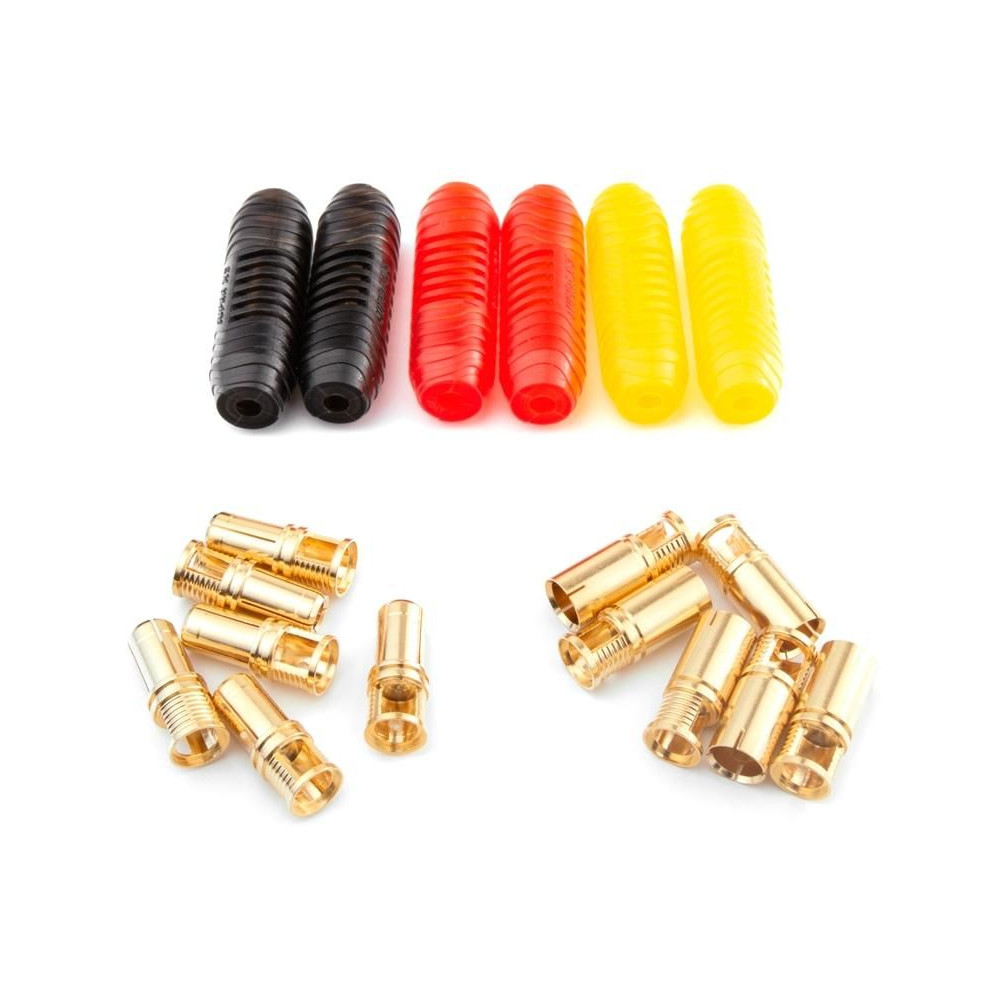 Három darab aranyozott 5 mm-es csatlakozó házzal a váltakozó áramú fordulatszám-szabályozó és a motor csatlakoztatásához. Kábel 3,3-5,3 mm2 (10-12 AWG), állandó áram 120 A, csúcsáram 160 A. 6 pár (2 fekete, 2 piros és 2 sárga) kábelcsomag, összesen 2 motor és 2 vezérlő csatlakoztatásához.