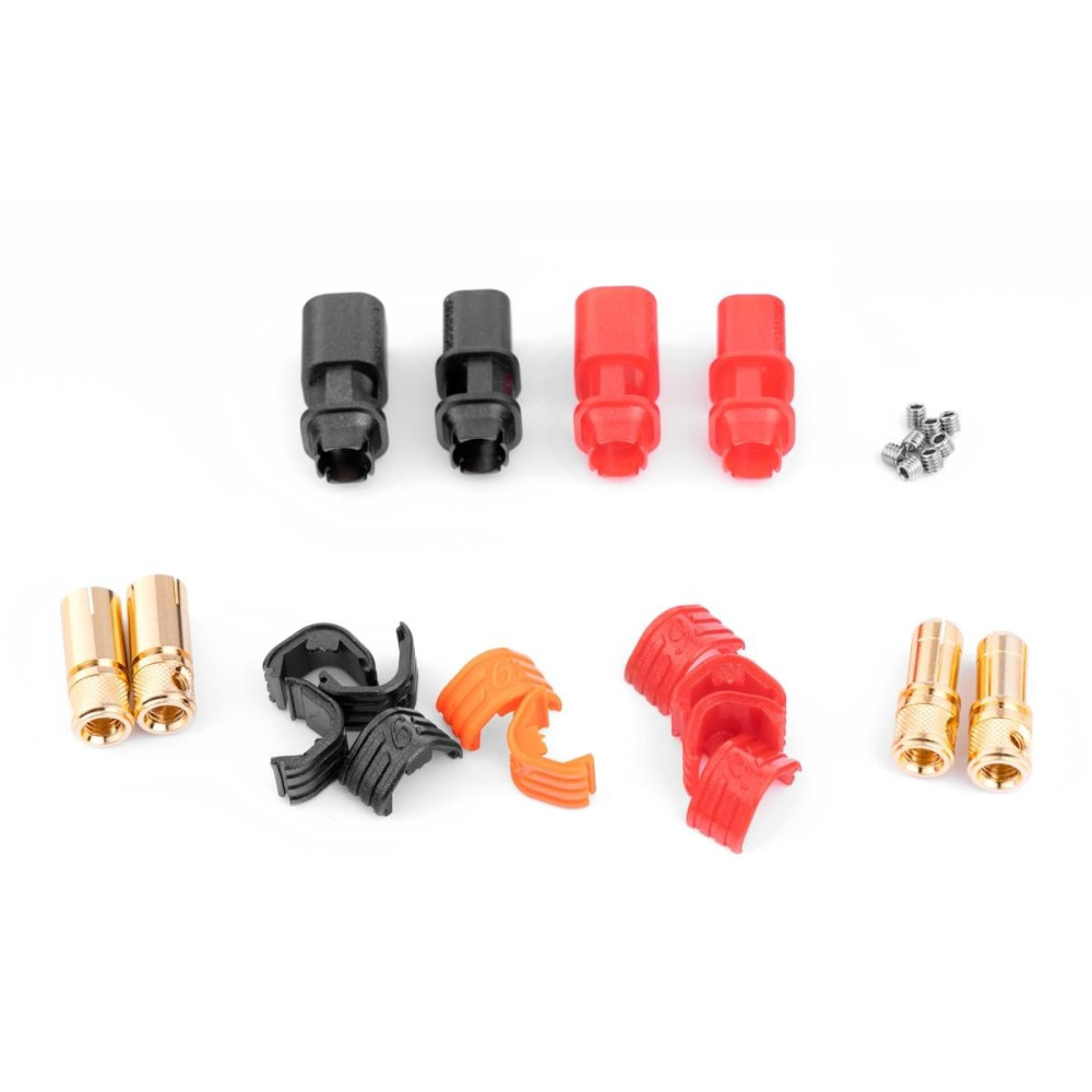 Aranyozott 6 mm-es csatlakozók házzal 8,4 mm2-es (8 AWG) kábelhez. Állandó áram 240A, csúcsáram 280A. Forrasztásmentes változat - a kábel rögzítése két imbuszcsavarral történik. 2 pár darabos csomag (1 piros és 1 fekete).