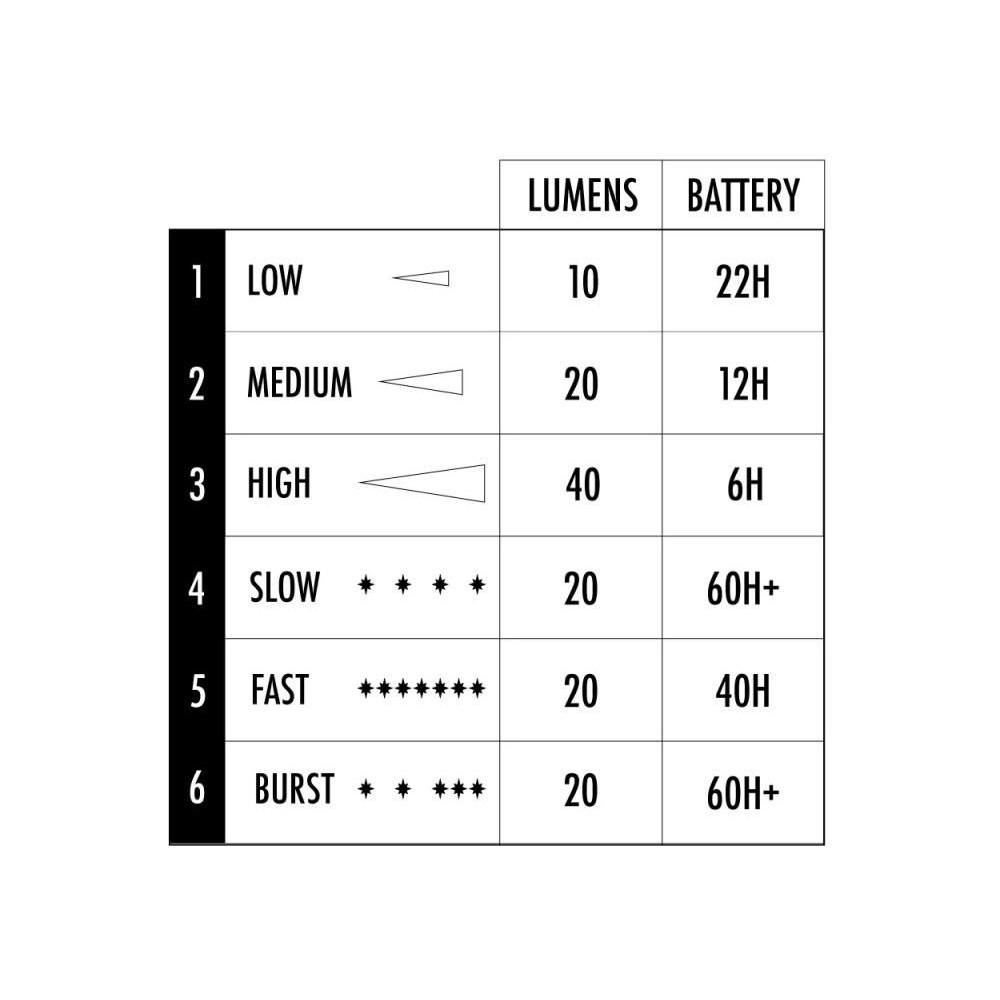 Minden lámpa pirosan világít, és maximális fényárama 40 lumen; Az akkumulátor élettartama maximális teljesítményen 360 perc. A fény akár 2 km távolságból is látható. A lámpa oldalán található gombokkal módosíthatja a fény intenzitását és a világítás módját (megszakítás nélküli fény, különböző villogási frekvenciák). A csomag két lámpát és egy 2 csatlakozós USB-C kábelt tartalmaz. IPX7 védelmi szint. Tartót kell vásárolni a lámpához.Více informací