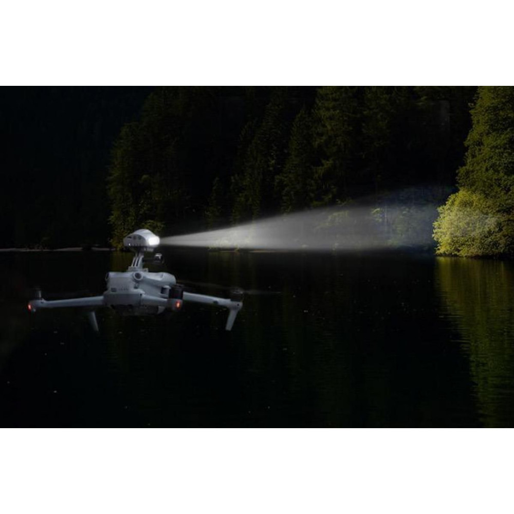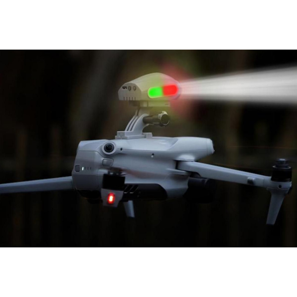 Univerzális keresőlámpa drónokhoz beépített akkumulátorral. Szürke színű, tartós ABS anyagból készült. Kompakt méretek 7 × 6,5 × 4,7 cm, súly 62 g. Teljesítmény 3W, fényerő 500–550 lm, utófény akár 100 méterig. A beépített 1100mAh-s akkumulátor 2–10 órás működést biztosít, töltési idő kb. 2 óra. 4 villogó módot kínál. Ideális éjszakai repülésekhez és keresési műveletekhez.