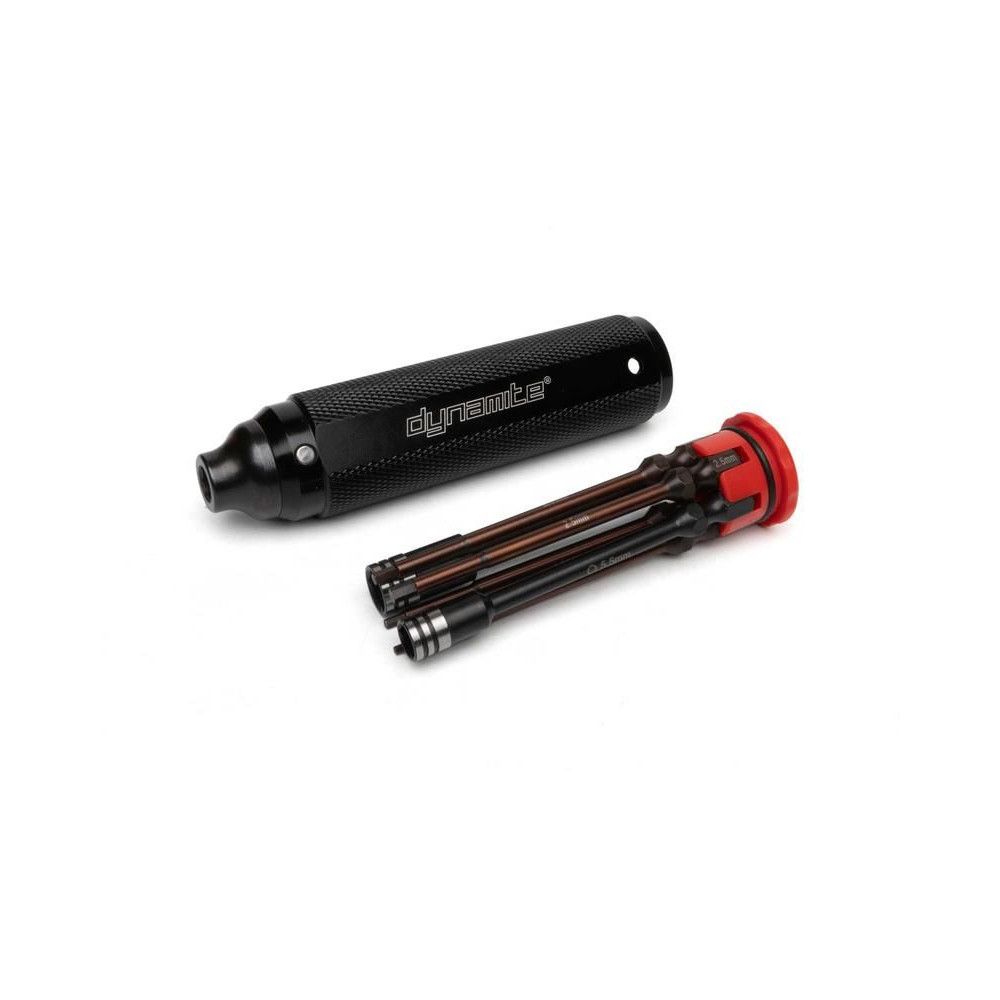 6 cserélhető bitet tartalmazó csavarhúzó, amely biztonságosan tárolható az alumínium fogantyúban, amelyre az 1:10 méretarányú RC autók szervizelésekor lesz szüksége. A bitek bármilyen elektromos kézifúrógépben vagy csavarhúzóban használhatók. Bitméretek - 6 óra. 0,050", 1,5 mm, 2 mm, 2,5 mm és 5,5 mm és 7 mm-es foglalatméretek.