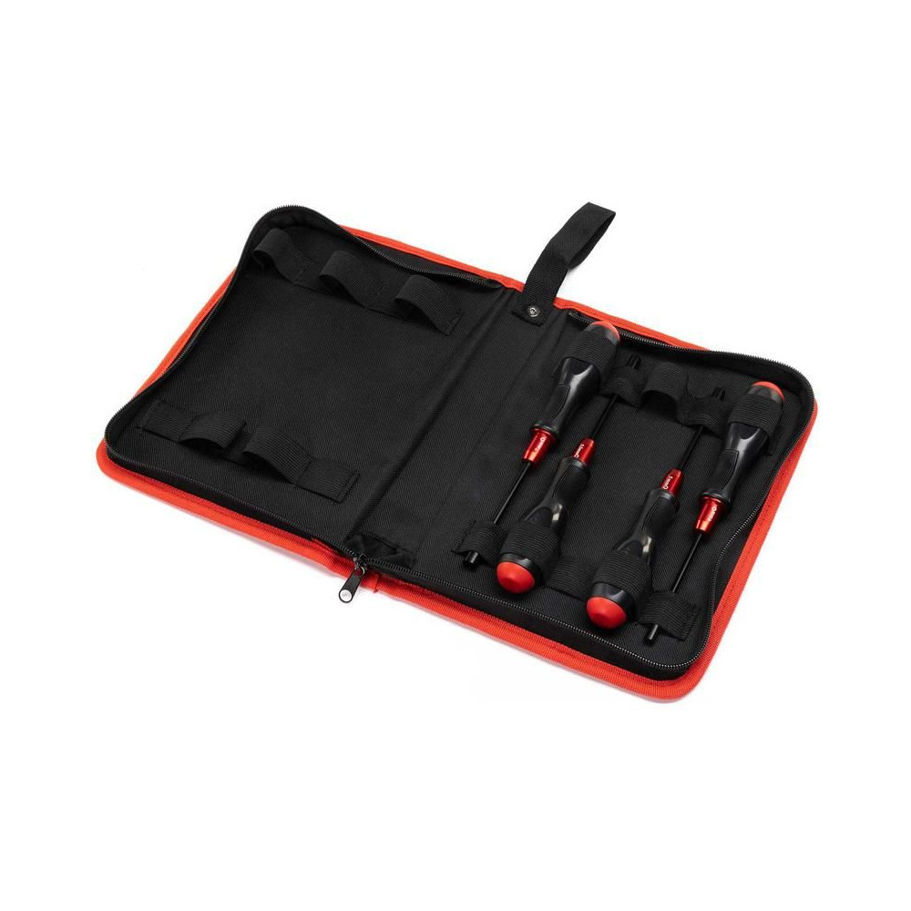Csavarhúzó készlet, metrikus dugókulcsok (4 db), 4mm, 5mm, 5,5mm, 5,5mm és 7mm méretű dugókulcsokat tartalmaz. A Dynamite készlet ergonomikus kialakítású, formázott műanyag nyéllel rendelkezik, forgatható véggel a kényelmes csavarozáshoz. Szerszámtáska logóval.