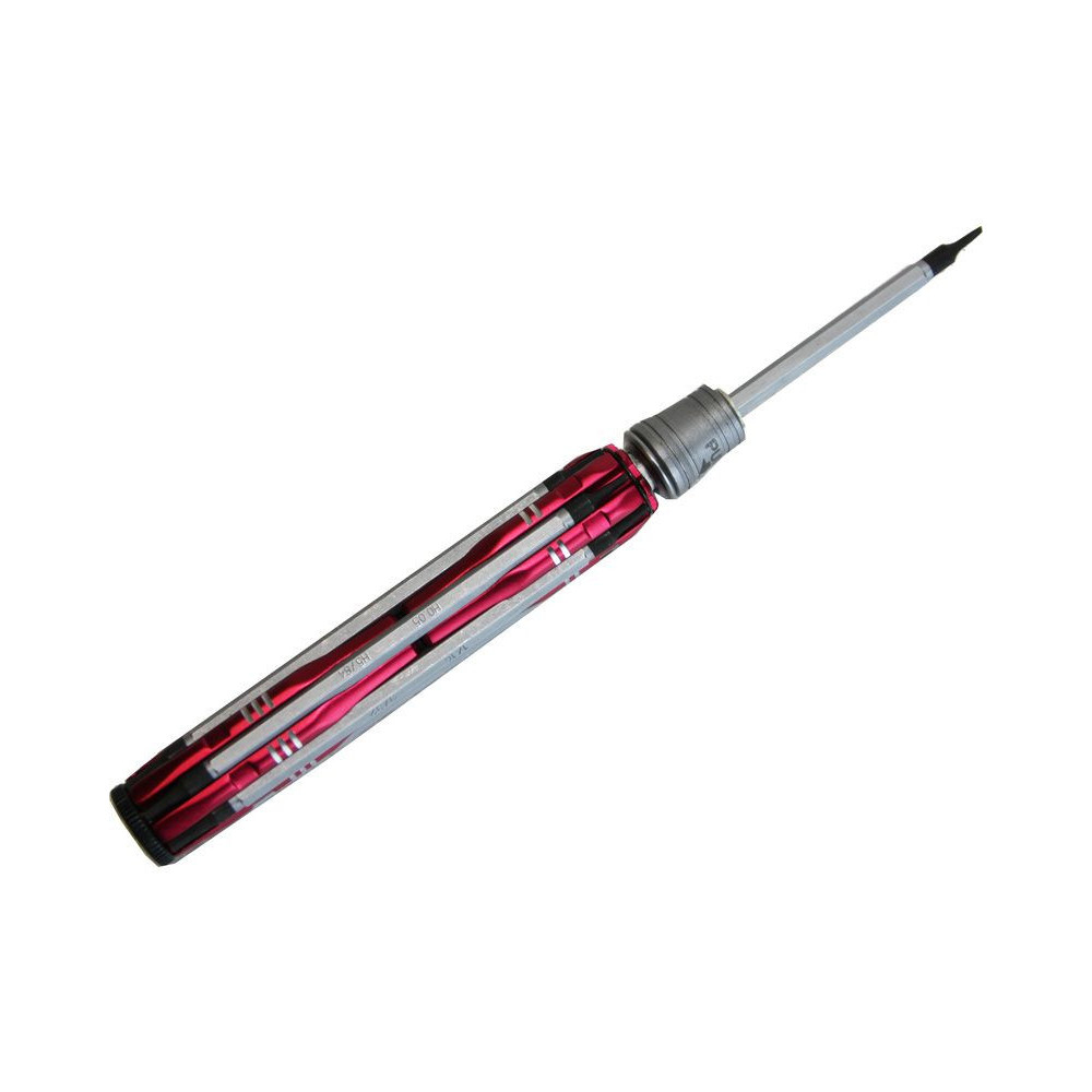 Csavarhúzó cserélhető, kétoldalas bitekkel, amelyek gyakorlatilag a fémnyélbe vannak integrálva. A bit hossza 100 mm, a nyél hossza állítható, a nyél hossza 127 mm, átmérője 18 mm.