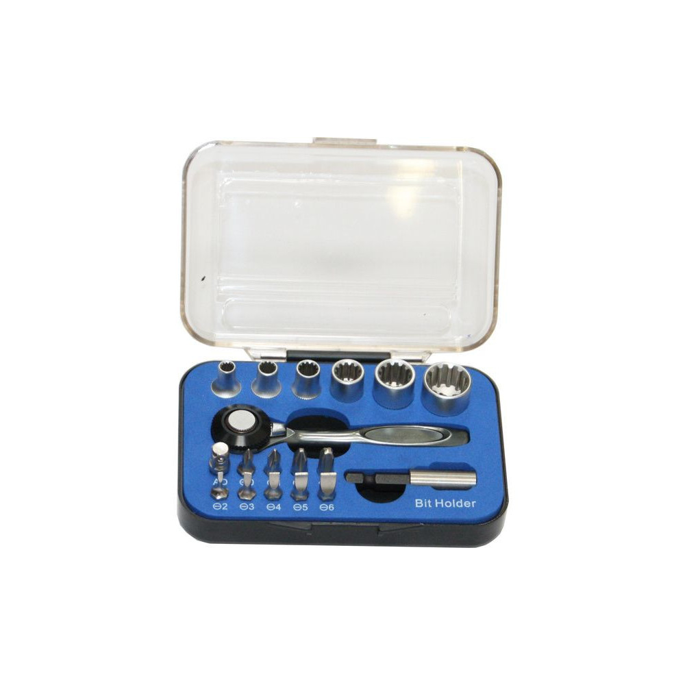 Tizennyolc darabos golakészlet racsnival és bitekkel, praktikus, tartós tokban.