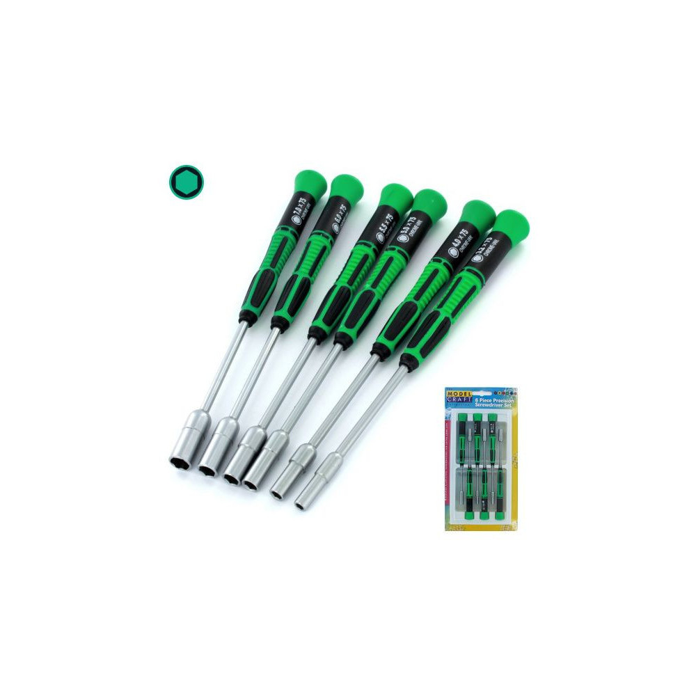 Modelcraft hatszögletű csavarhúzók ( 6 db-os készlet ) króm-nikkel acélból. Műanyag fogantyúk forgatható fejjel, a szár hossza dugókulccsal 75 mm, a nyél hossza 100 mm, átmérője 17 mm. Hosszú belső üreges rész az anyacsavarkulcshoz.