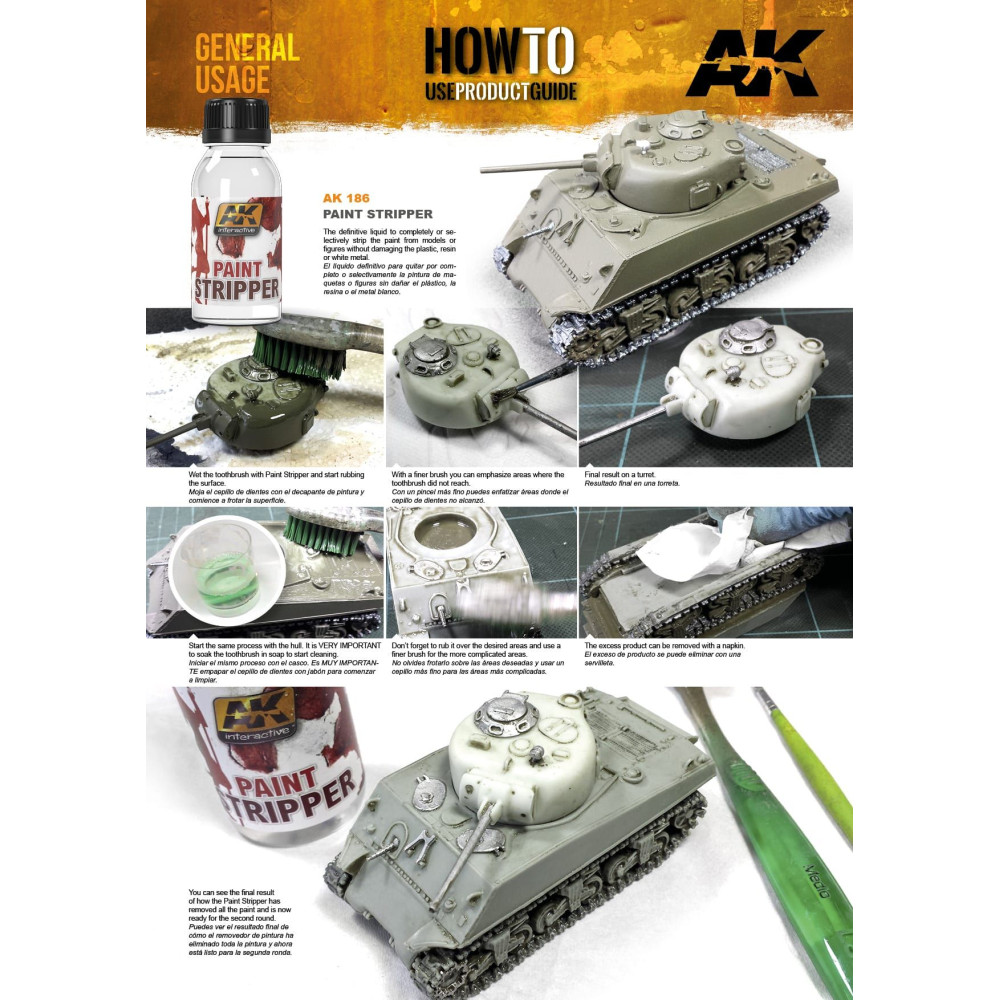 Dokonalá tekutina na úplné alebo selektívne odstránenie farby z modelov alebo figúrok bez poškodenia plastu, živice alebo bieleho kovu.