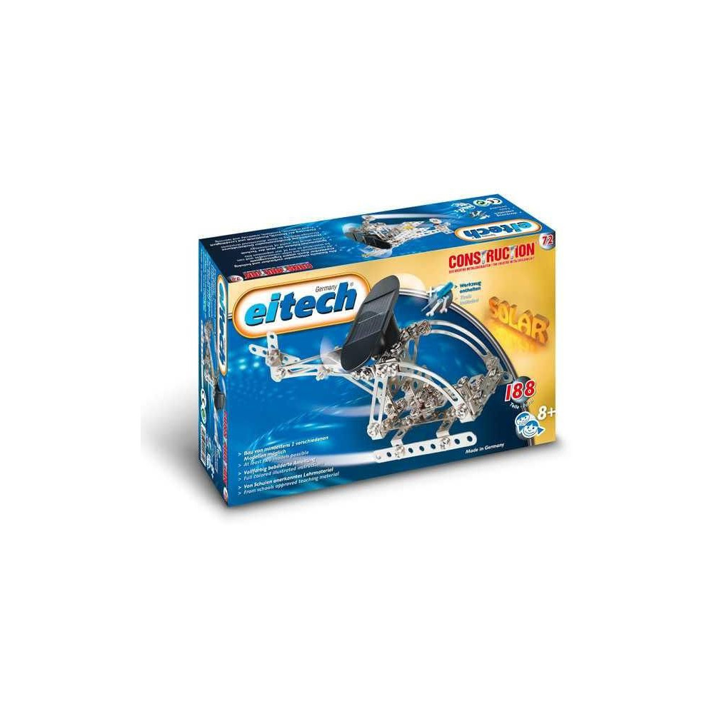 C72 építőkészlet (25-4079). Több mint 188 alkatrészt és egy nagy teljesítményű napelemet (0,5 V) tartalmaz. Szerszámokat tartalmaz. Tartalmazza a 2 modell összeszereléséhez szükséges illusztrált útmutatót. Kompatibilis más Eitech készletekkel. Felnőtt segítsége ajánlott.