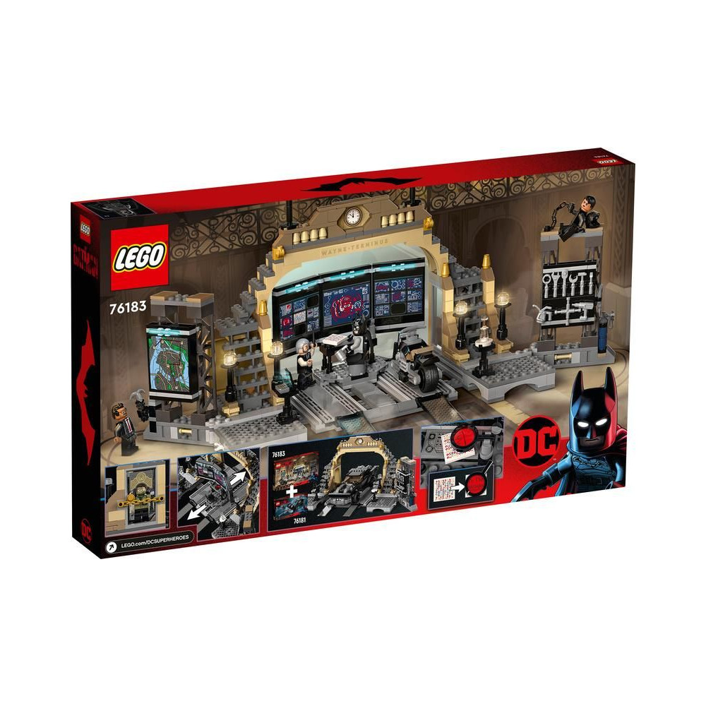 A Batman barlangja számítógépekkel, szerszámokkal és a járművek javításához szükséges hegesztőberendezésekkel van felszerelve. Két oldalfal, amelyek közül az egyik egy nagy GOTHAM CITY™ térképet, a másik pedig egy szerszámtartót ábrázol, kifordítható, így különböző irányokba forgathatóak, hogy még több hely legyen a játékhoz. A készlet 6 minifigurát tartalmaz A Batman filmből: Batman, Selina Kyle, Riddler, Rogue, Alfred és Gordon rendőrfőnök. A Riddler titkosított üzeneteit tartalmazó három darabot csak egy speciális nagyító segítségével lehet elolvasni, amely lehetővé teszi a nyomok megfejtését. Amikor Batman motorra száll, beöltözhet alteregójának: Rogue-nak. Ha pedig elfogott rosszfiúkkal tér vissza, egy barlangban lévő cellába zárhatja őket. A Batmobil készletből származó Batmobil is felállítható a javító rámpára: Chase the Penguin (76181, nem tartozék).