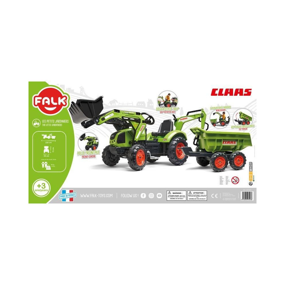Gyermekeknek szánt pedálos traktor, FALK márka. Egy valódi Claas kotró traktor másolata. A gyermektraktor elülső rakodóval, kotróval, Maxi mellékvágánnyal, forgóüléssel és kürttel van felszerelve a végtelen gyermekjátékokhoz. A 3 és 7 év közötti gyermekek számára készült.