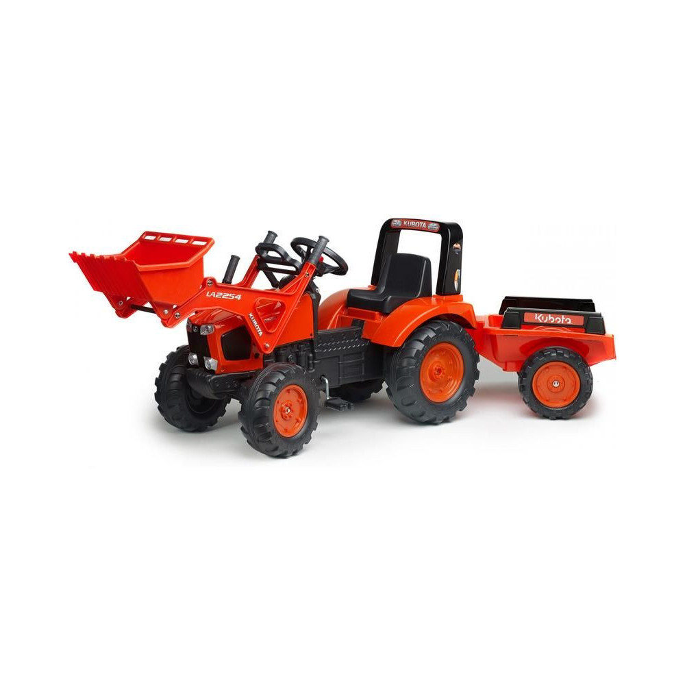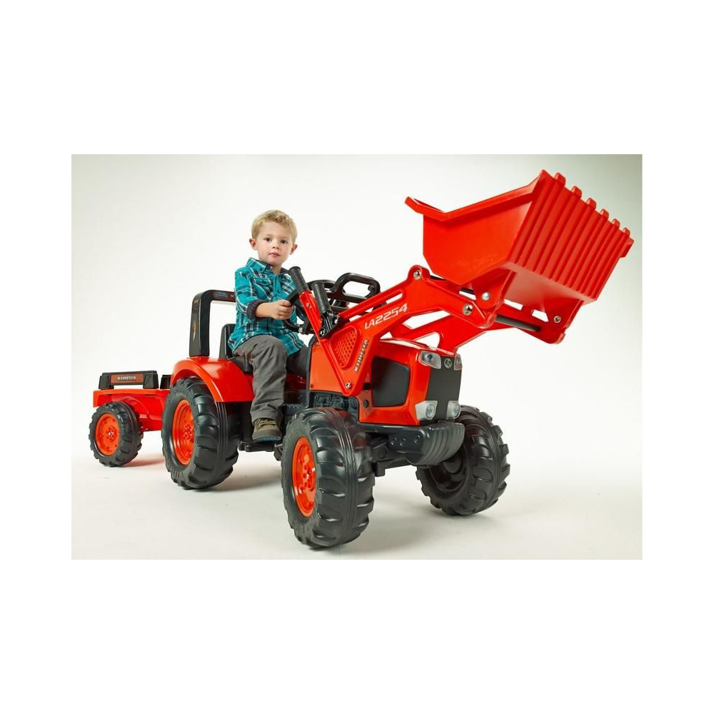 Kubota M135GX pedálos traktor első rakodóval, levehető mellékvágányokkal és működő kürttel. Alkalmas 3 és 7 év közötti gyermekek számára.