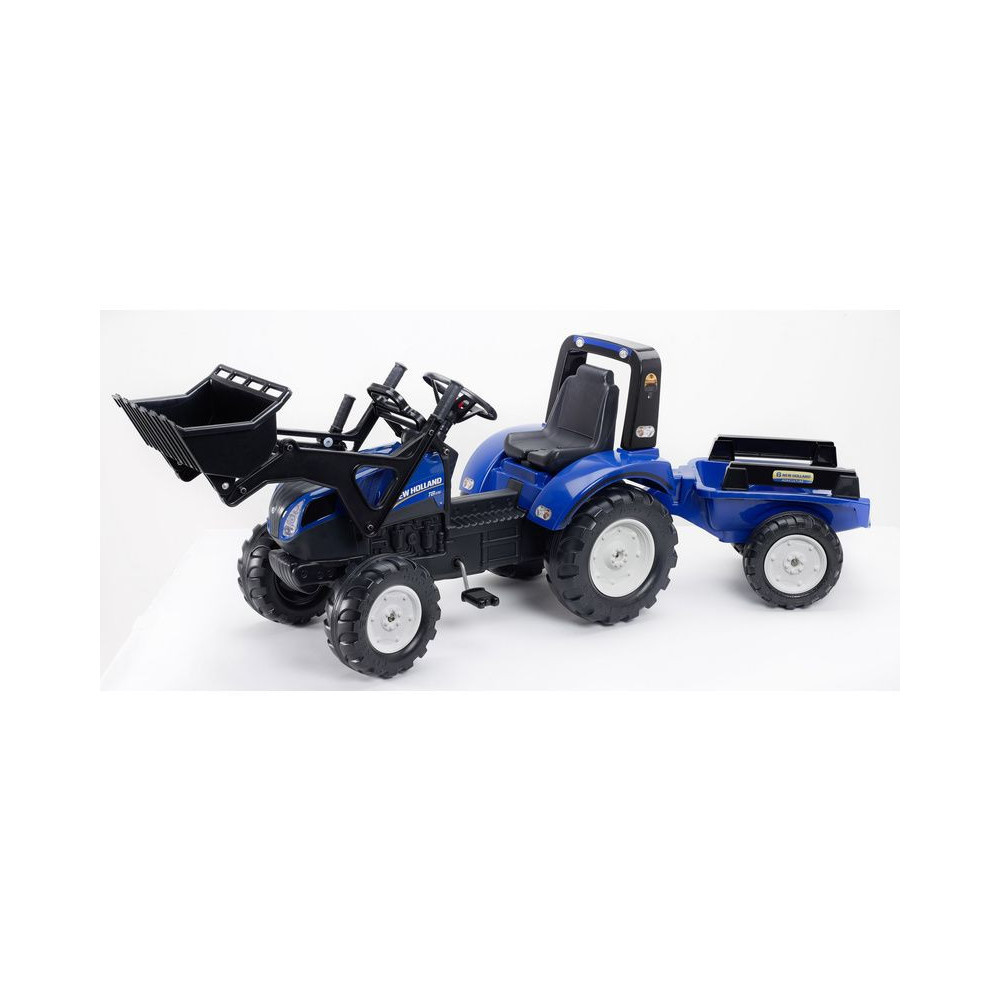 Pedálos traktor New Holland T8 rakodóval és oldalkocsival, gyártó FALK. A traktort elsősorban a biztonságot szem előtt tartva tervezték, a pedálos traktor stabil és könnyen kezelhető. Az elülső mechanikus rakodó lehetővé teszi, hogy a gyerekek szórakoztató módon tanulják meg a mechanikai funkciókat, akárcsak egy valódi traktoron.