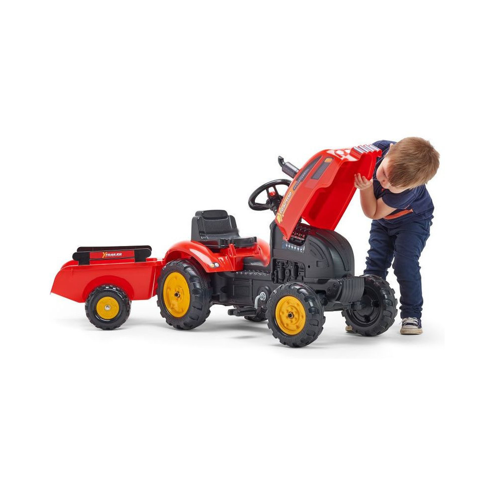FALK X-Tractor pedálos traktor a francia gyártótól, levehető mellékvágánnyal, funkcionális kürttel a kormánykeréken és nyitható motorháztetővel felszerelve. Tartós műanyagból készült, a gyermekek biztonságát szem előtt tartva. 2 és 5 év közötti gyermekek számára készült.