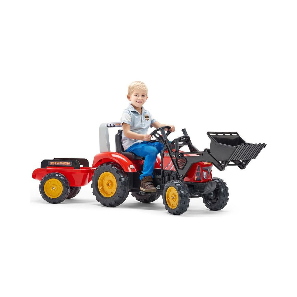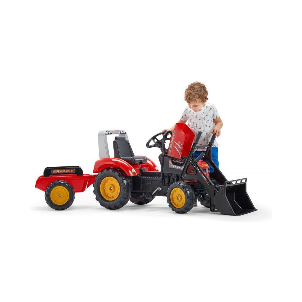 Gyermek pedálos traktor FALK - Supercharger, piros kivitelben, rendkívül tartós műanyagból készült, első rakodóval, levehető mellékvágánnyal és a kormánykeréken lévő kürttel felszerelve. Egy jól ismert traktormárka valósághű másolata. A 3 és 7 év közötti gyermekek számára készült.