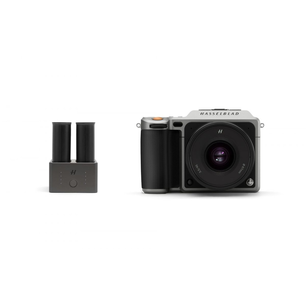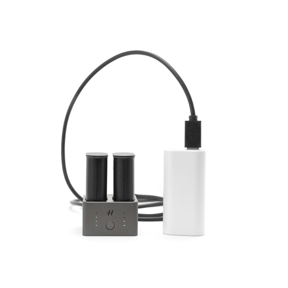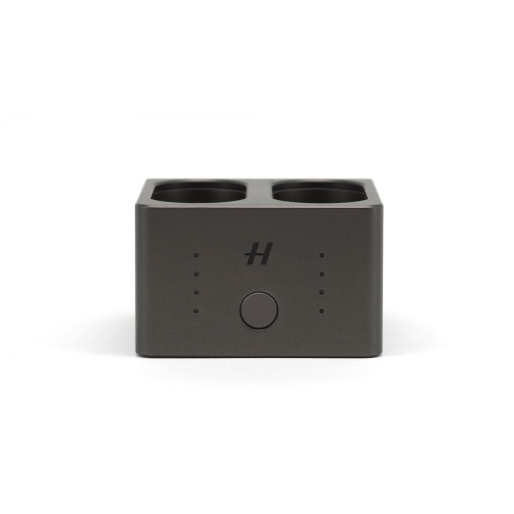 A Hasselblad töltőközpontja az X1D-50c fényképezőgéphez kettős foglalatot tartalmaz, amely támogatja két akkumulátor egyidejű töltését.
