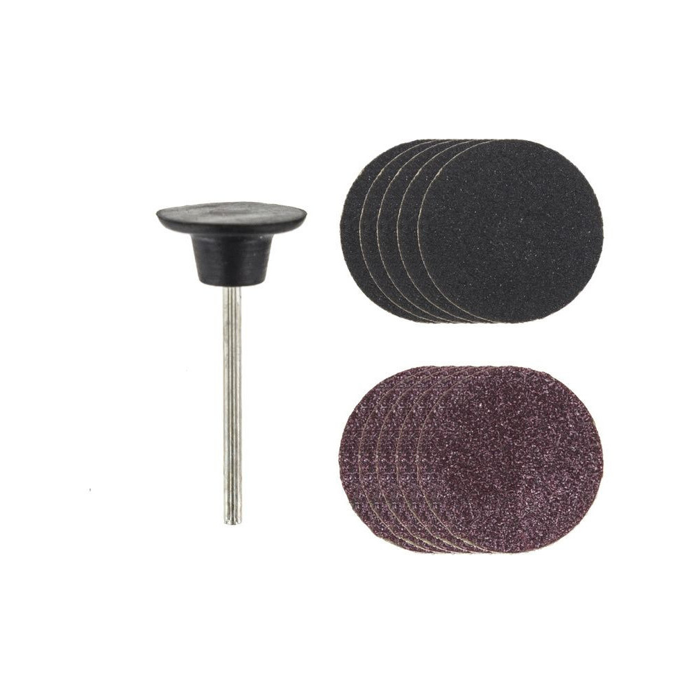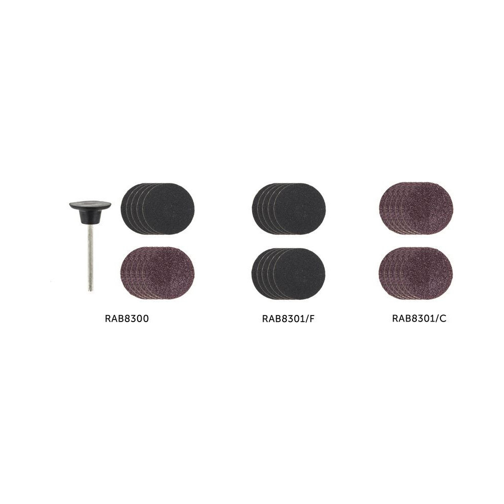Rotacraft szárcsiszoló gumifogóval és 5 durva és 5 finom csiszolókoronggal, 23 mm átmérővel, fém, műanyag, fa és kő munkadarabok megmunkálásához. A gumitárcsa 2,35 mm-es száron van. 20 000 fordulat/perc maximális fordulatszám.