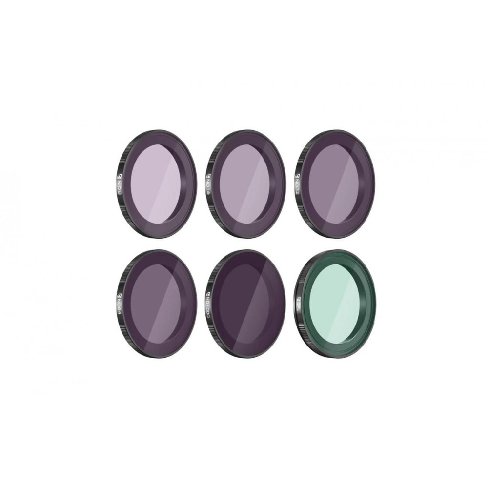 Hat darab Freewell szűrőből álló készlet a DJI Action 4. A készlet tartalmaz szürke szűrőket ND8, ND16, ND32, ND64, ND1000 és egy körkörös polarizációs szűrőt.