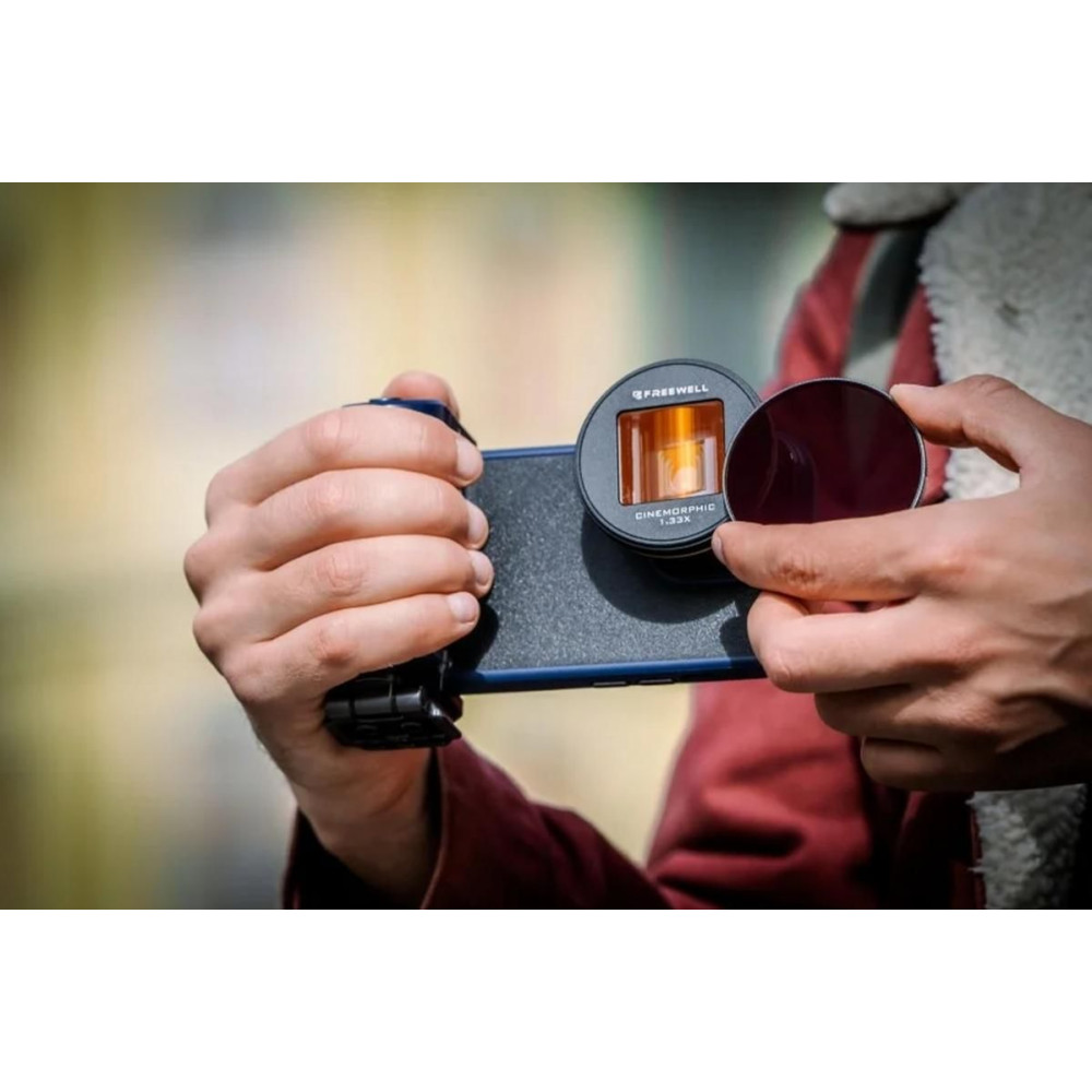 A Gold Streak 1,33x anamorfikus objektív új generációja a Sherpa rendszerhez. Kompatibilis az iPhone 13/14/15 Pro/Pro Max és Samsung Galaxy S23 Ultra tokokkal. Tartalmaz egy anamorfikus Gold Streak lencsét a gyönyörű filmszerű arany fénypontok eléréséhez 2,39:1 képaránnyal.