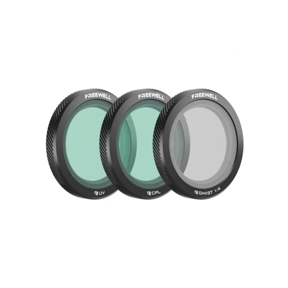 Három darabos Freewell szűrőkészlet DJI Air 3S drón kamerájához. A készlet tartalmaz egy UV szűrőt, egy Snow Mist 1/4 effektusú szűrőt és egy CPL szűrőt.