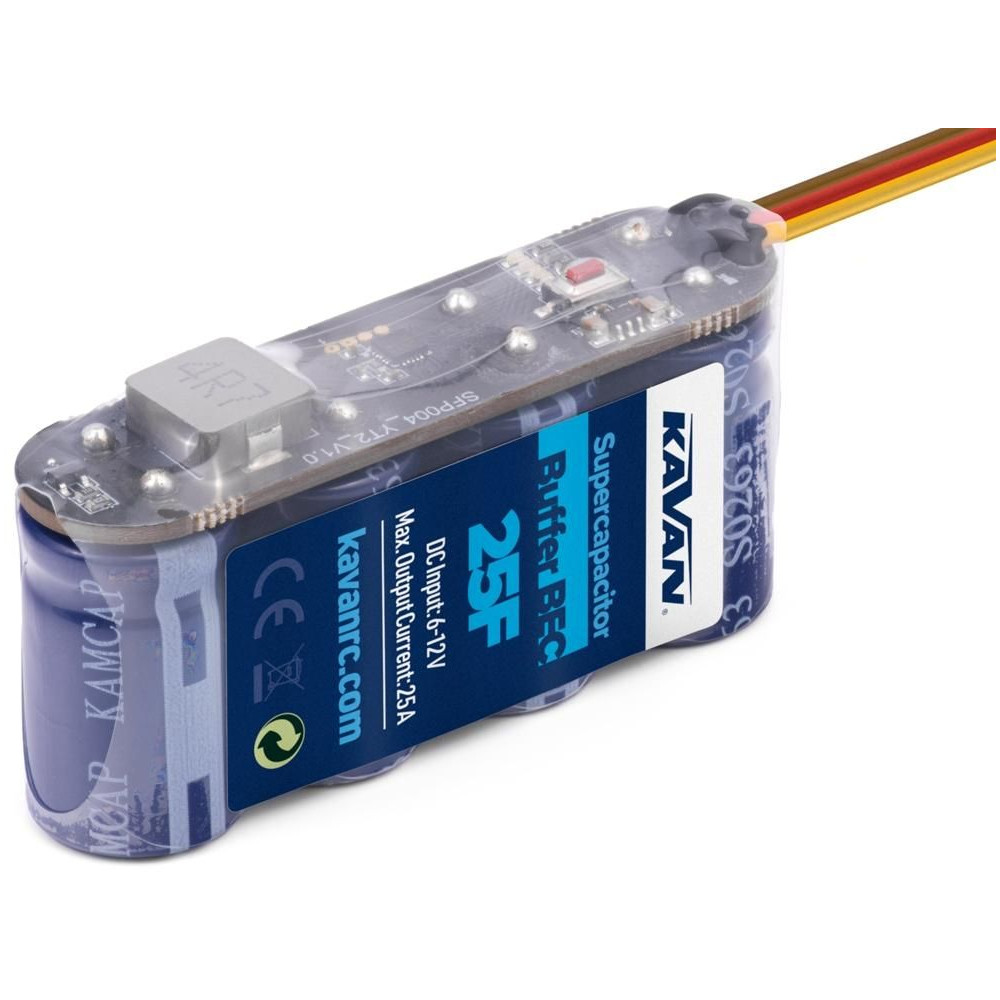 25F/6-12V/max. 25A szűrő szuperkondenzátor RC modellek fedélzeti elektronikájának tápfeszültségének szűrésére. A rendkívül nagy kapacitású kondenzátor lehetővé teszi a rövid távú fogyasztási csúcsok kompenzálását, amelyek egyébként a vevőegység tápfeszültségének csökkenését okoznák (a leállás kockázatával).