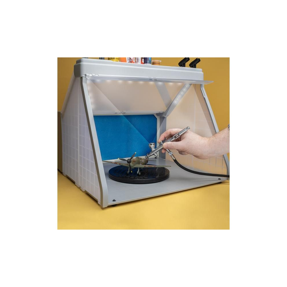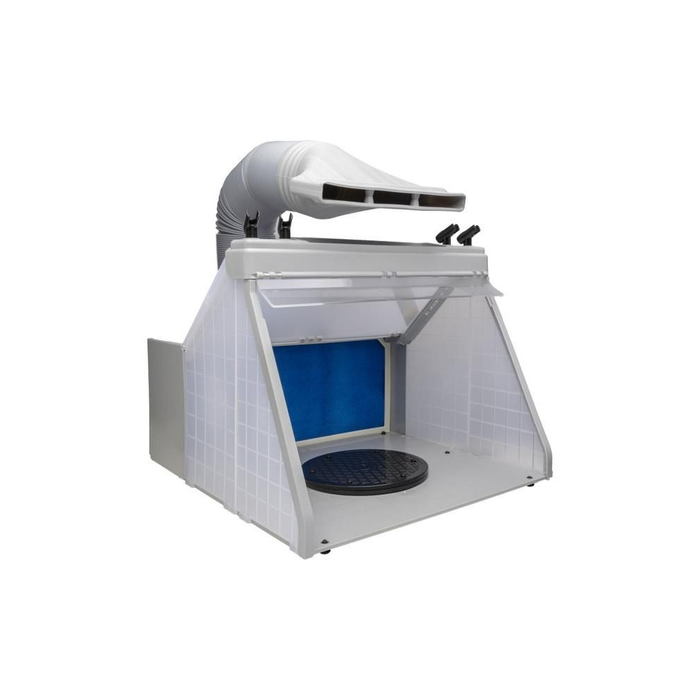 Spraycraft szóródoboz szívással, 220 mm-es forgóasztallal, szellőzőtömlővel és szűrővel. Szívóteljesítmény 3 m³/perc, belső munkaterület 40,5x21,5x29 cm. Ideális műanyag modellek és hasonlók festésére.