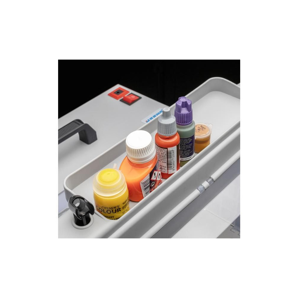 Spraycraft szóródoboz elszívóval, 220 mm-es forgóasztallal, szellőzőtömlővel és szűrővel. Tápellátás 230 - 240 V/50 Hz, szívóteljesítmény 3 m³/perc, belső munkaterület 40,5x21,5x29 cm. A szóródoboz praktikus megoldás minden modellező, hobbi és szakember számára, akik légpisztolyokkal és aeroszolos szórófejekkel dolgoznak. A doboz segít felfogni a felesleges festéket és a szórófej gőzét, így tisztán tartja a munkaterületet és javítja a munkakörülményeket. Az integrált szívó- és szűrőrendszernek köszönhetően a permetezett festékrészecskék nagy részét felfogja. Beépített LED-világítás a jó láthatóságért munka közben. A doboz felső oldalán található egy rekesz a festékes flakonoknak és egy tartó a szórópisztolyoknak.