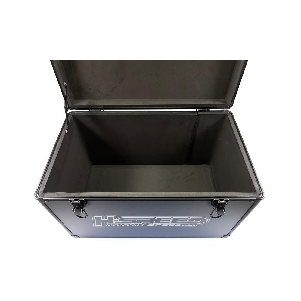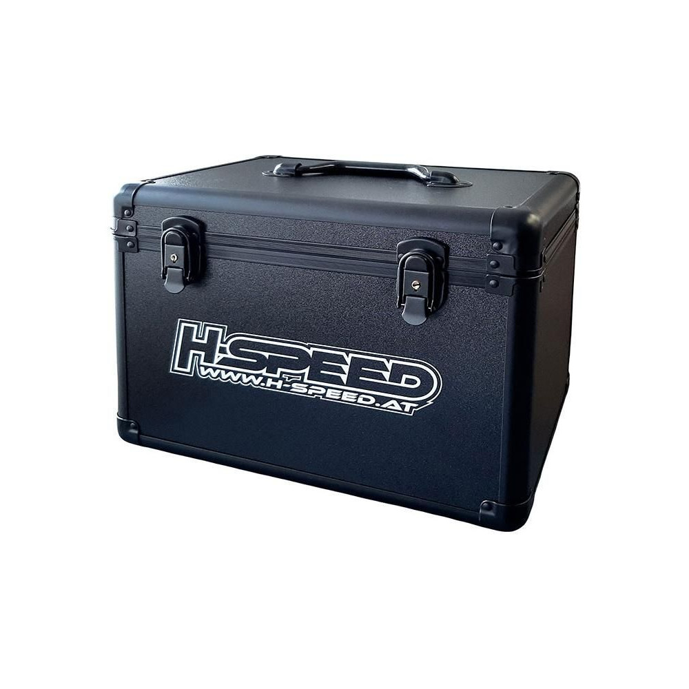 H-Speed szállító és tároló koffer LiPo akkumulátorokhoz és modellkiegészítőkhöz XL méretben, 50 x 30 x 27 cm méretekkel. A csuklós fedél két karos csattal zárható. Két kulcs a csomagban. Összecsukható fogantyú. Belső habszivacs bélés. Műanyag lábak.