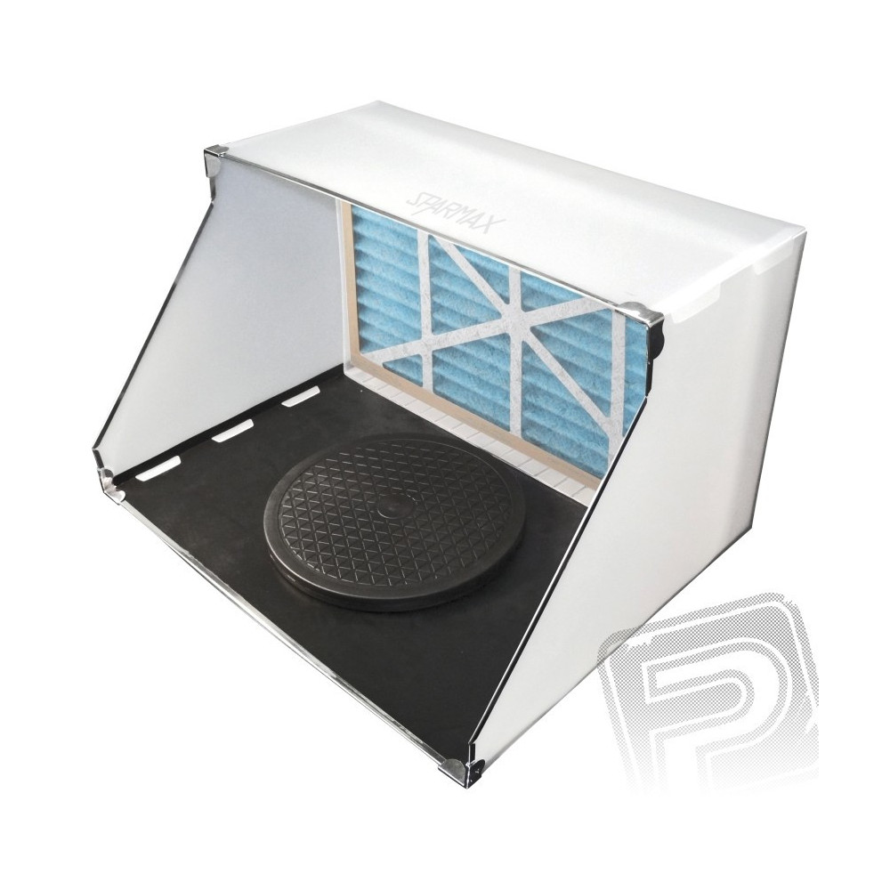 Profi permetező doboz 523x403x316mm a makett modellezők részére a finom munkára. elszívás axiális ventilátorral, kétfokú nagyméretű szűrő alkotja a doboz teljes hátsó falát, amely lamináris áramlást biztosít a dobozban.