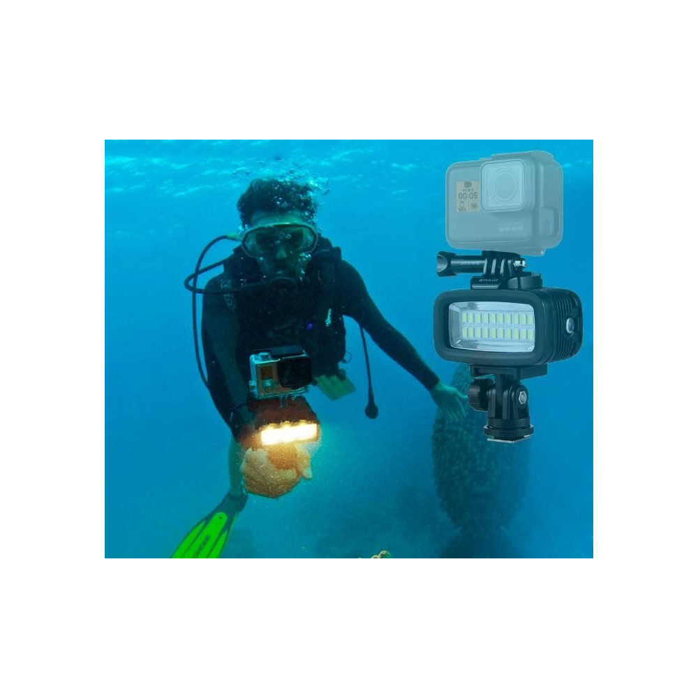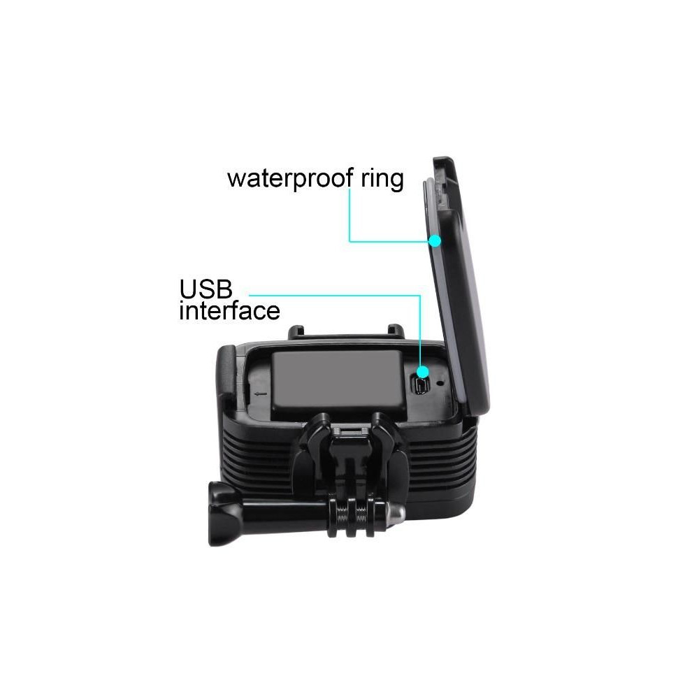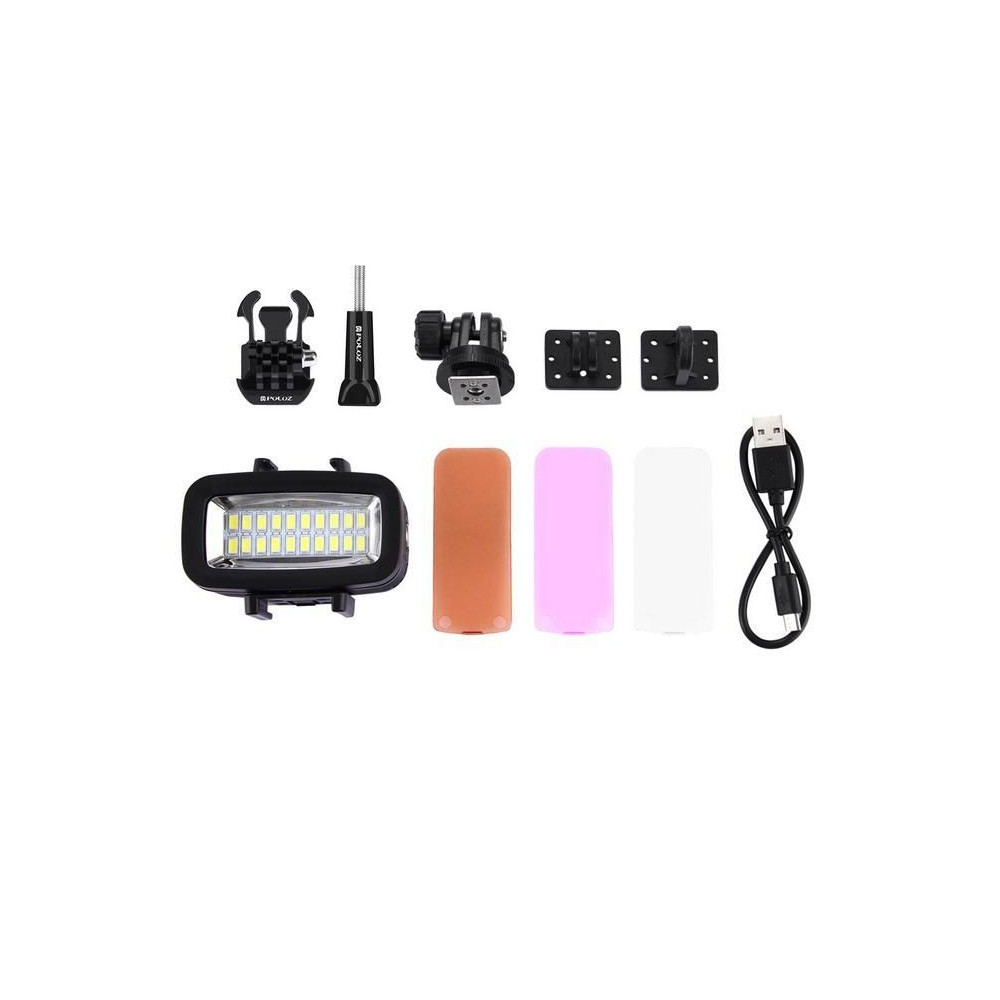 A PULUZ vízálló LED világítás (700lm) újratölthető akkumulátorral (1900mAh) ideális az egyszerű összeszerelés és a nagy fényáram miatt. Színhőmérséklet: 5500K LED-ek száma: 20 Tömeg: 149g Feszültség: 3.7V Max. mélység: 40 méter
